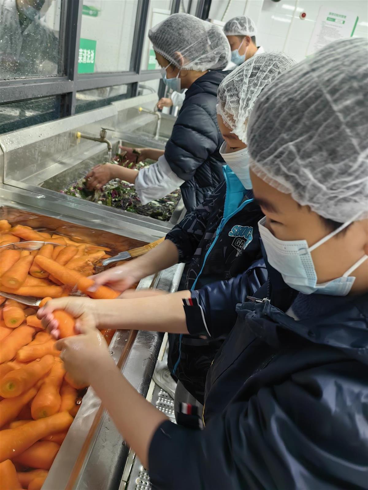 曾于12月17日担当“一日食堂小管家”的606班学生周辰菲、宋昕玥说,当天他们5:50就到学校食堂了,“天还没亮,我们就学着食堂阿姨的样子,仔细查看蔬菜新鲜度、核对食材数量。”另一位体验者陈晓涵对洗菜环节印象最深,她说,洗菜从早上7点开始,要洗得特别仔细才行,她洗了一会胡萝卜就累了,但食堂阿姨们说她们每天要洗200多斤蔬菜,去泥、除杂、漂洗等都要花快三个小时。”担当“分餐小使者”“送餐小帮手”等的小朋友也各有各的“修炼”:有人说“最怕分不均匀,使有的班多、有的班少”;有的说“把餐车推好也要学会用巧劲”;有的说“分餐需要算好量,还要考虑低年级同学吃得慢、高年级同学活动量大等因素,有临时加餐还要马上协调”。
