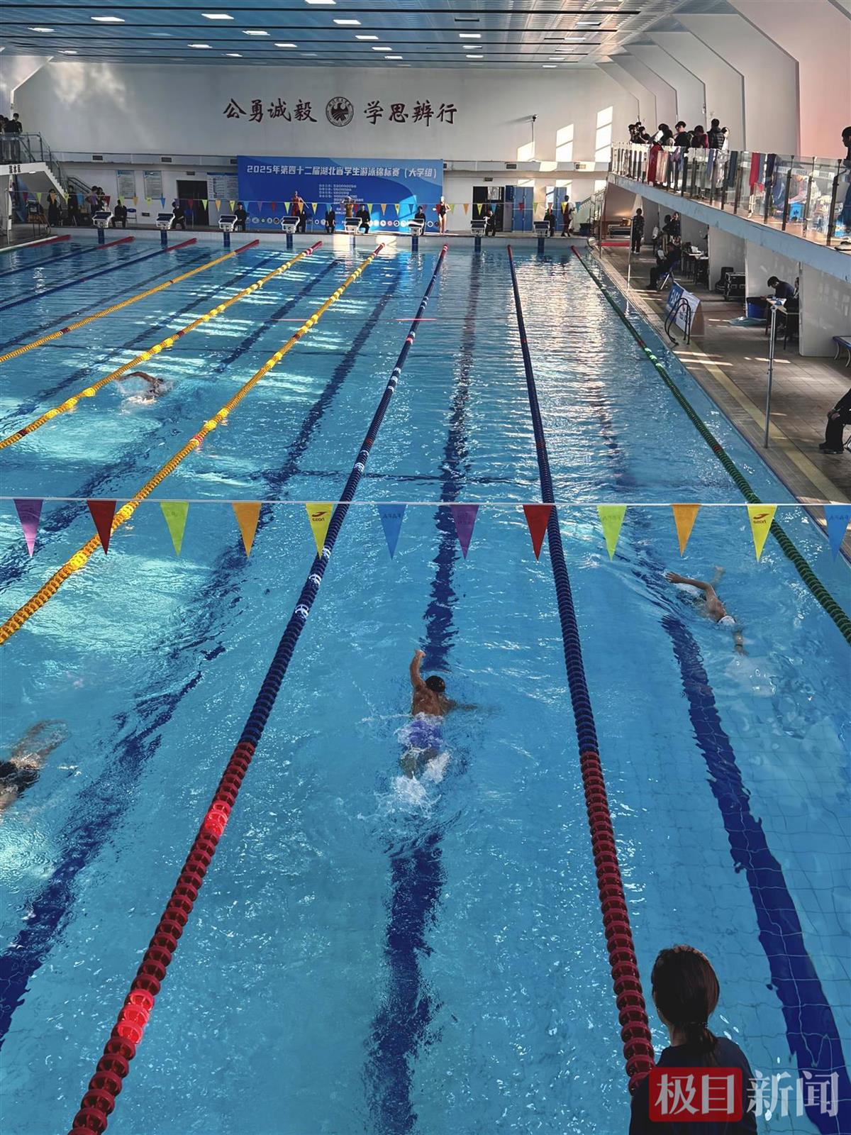 12月27日,在2025年湖北省第四十二届学生游泳锦标赛(大学组)的赛场上,湖北国土资源职业学院学生刘吉分别以1分10秒89、2分47秒31夺得100米自由泳、200米自由泳冠军。