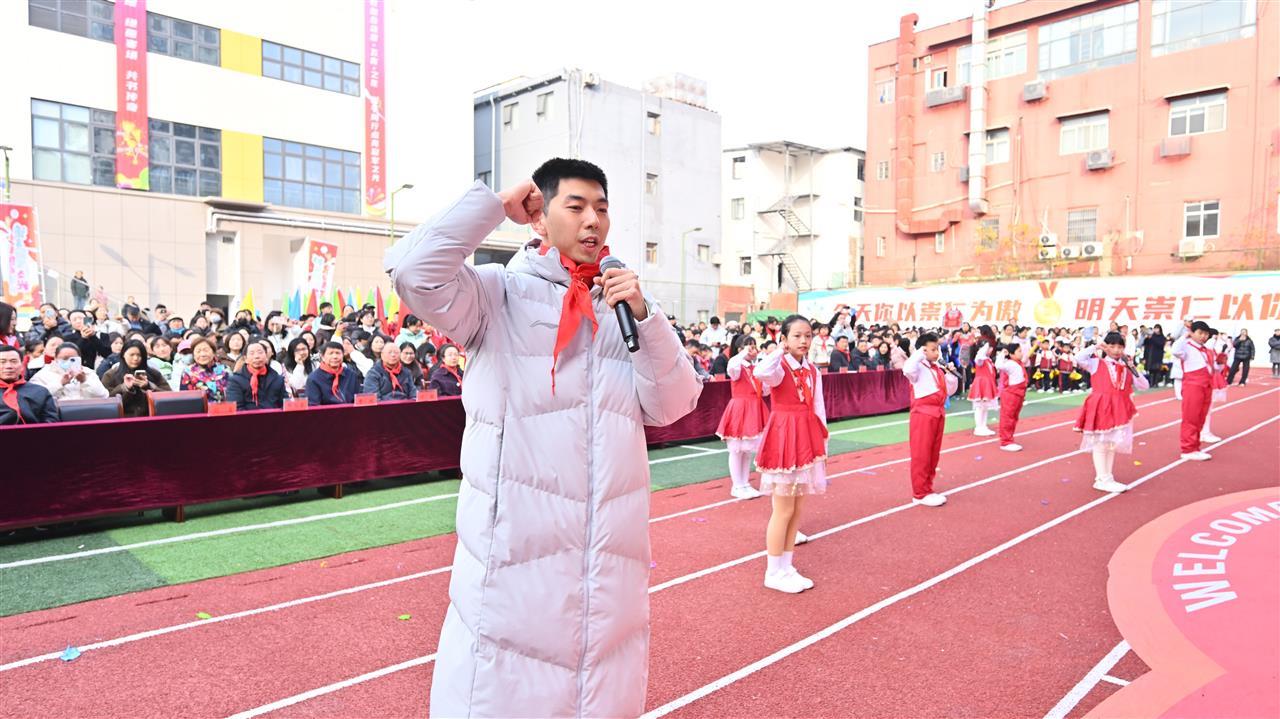 紧接着,闫子贝带领全体学生庄严宣誓。孩子们齐刷刷高举右拳,小脸绷得坚定,稚嫩却铿锵的誓言里,藏着强身健体、乐学善思的期许,更饱含着为校争光、为国成才的远大志向。