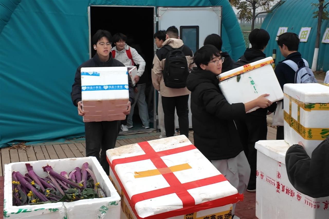 “注意握紧白菜根部,轻轻向上拔!”学生们弯腰俯身,动作虽显生疏却格外认真。不一会儿,一颗颗饱满的白菜整齐码放在田垄边。除草、采摘菜薹、转运南瓜……同学们分组投入各项农事环节,田间回荡着欢声笑语与互相提醒的声音。