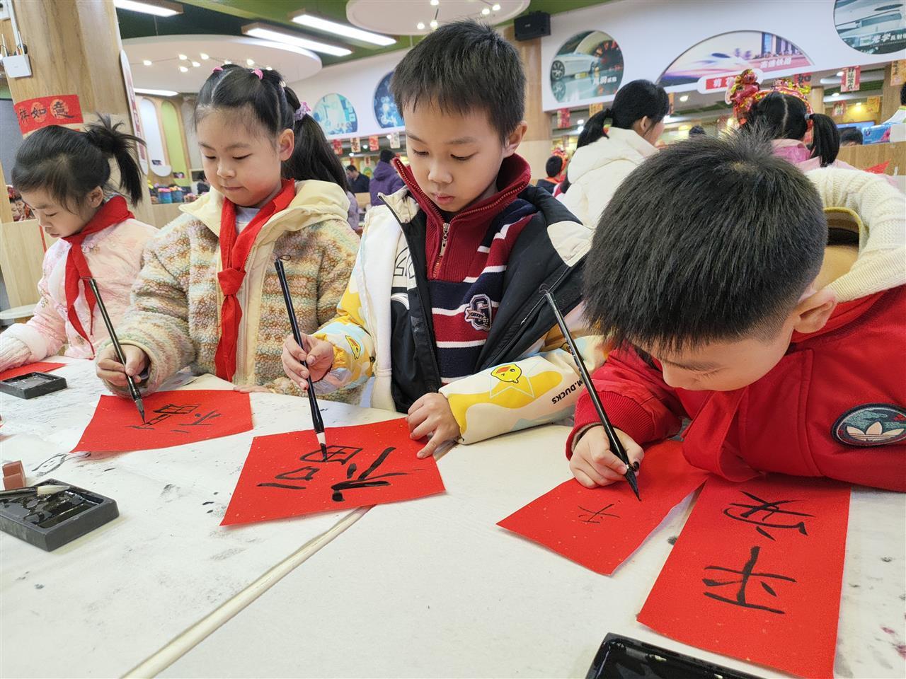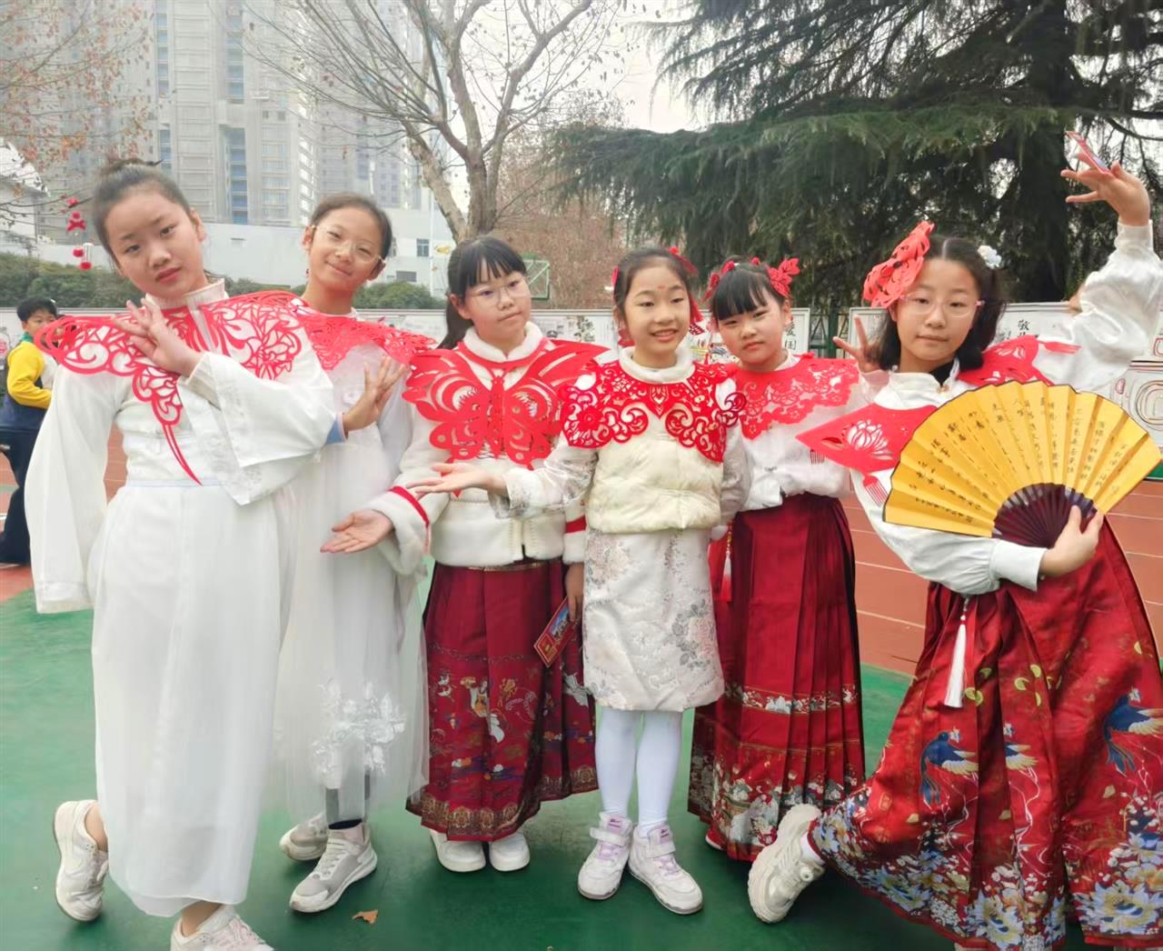 武胜路非遗工坊前排起长队,“福书阁”写春联、“剪花坊”做剪纸,一幅幅作品新鲜出炉,灵动又喜庆。五年级(4)班的同学们更将剪纸艺术巧妙融入服饰展示——飘逸的云肩缀满剪纸纹样,精致的头花绽放传统韵致,剪纸与汉服的精妙搭配让非遗文化“活”了起来。