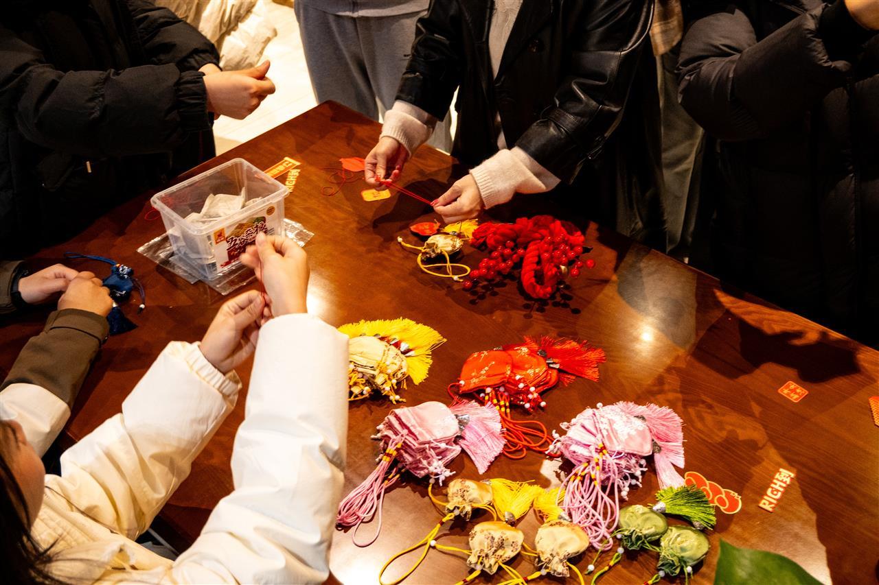 在剪纸艺术协会的区域,同学们专注地按照传统图样,用剪刀和刻刀创作出寓意吉祥的窗花与“福”字。一旁的创艺中国结区域,同学们挑选自己喜欢的绳线,在协会成员的帮助下学习编织“万字结”。丝线穿梭、指间往返,再缀以小巧配饰,一个个寓意吉祥的中国结在耐心与专注中诞生。“几个简单的绳结就能创造出一个有趣且寓意美好的装饰,亲身体验书本上的传统文化感觉很美好。”该校美术学院2025级本科生周亦逍激动地说,“今后将主动学习传统文化知识,积极参与传承实践。”