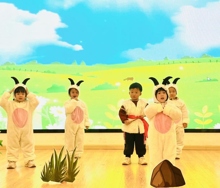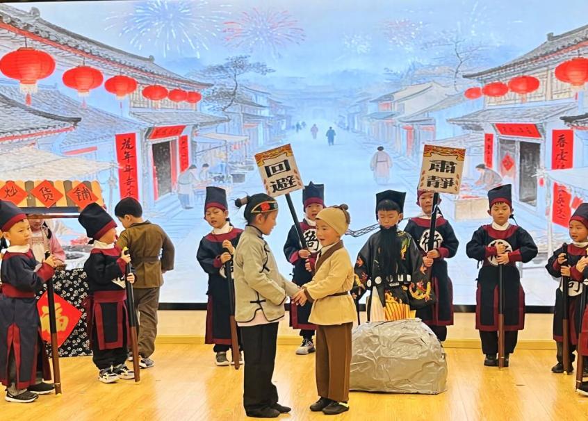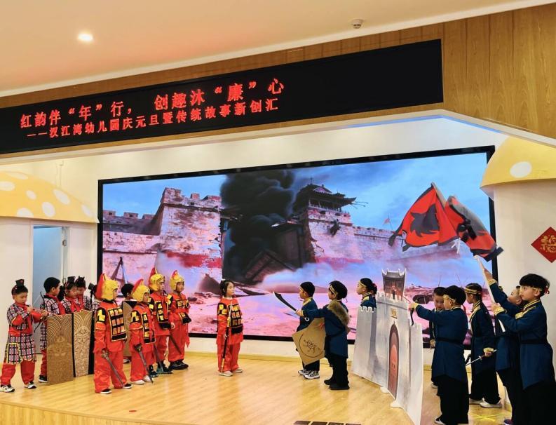 活动以温暖的新年祝福拉开序幕。老师们结合生活小事,用幼儿易懂的语言诠释“正直做人、诚实做事”的廉洁内涵,让“廉”的种子在孩子们心中悄然萌芽。随后的文艺展演环节亮点纷呈,小中大班幼儿们带来丰富节目,《金斧头银斧头》《狼来了》传递诚实诚信的美德,《鸡毛信》《长征路上的红小丫》重现红色故事中的勇敢担当,《木兰战歌》《大禹治水》《愚公移山》诠释坚守奋斗的精神,《吃水不忘挖井人》诉说感恩之情,《包公审石头》彰显廉洁品格,《小红马的宝石挑战赛》传递协作力量,用童趣演绎传递正向价值观。教师们也同台献艺,以多样艺术形式搭建起师生心灵桥梁,让红色精神在互动中代代相传。