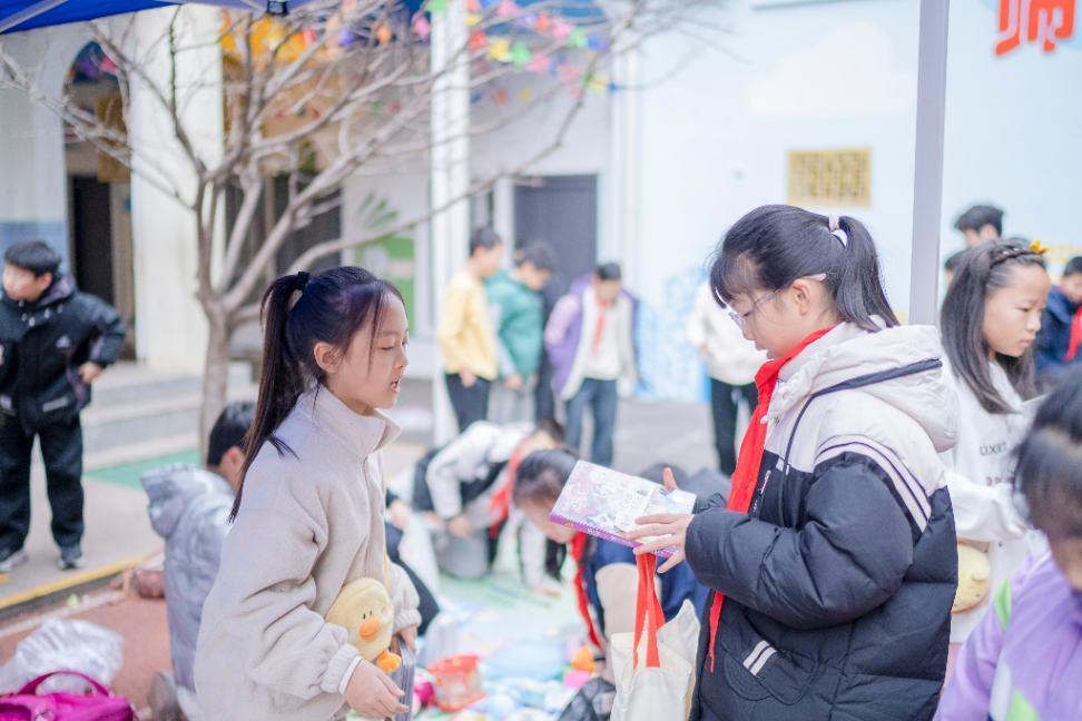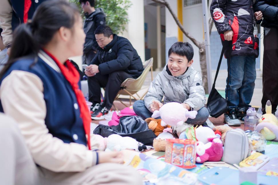 活动在激昂的架子鼓和活力街舞中拉开序幕,校合唱团一曲《裹着星的光》为寒冬增添了几分温暖。学校领导在致辞中鼓励孩子们在活动中学会分享、珍惜与实践,并特别强调了环保理念和家校共育的重要性。随着剪彩仪式完成,校园瞬间变成了一个热闹的“童心集市”。