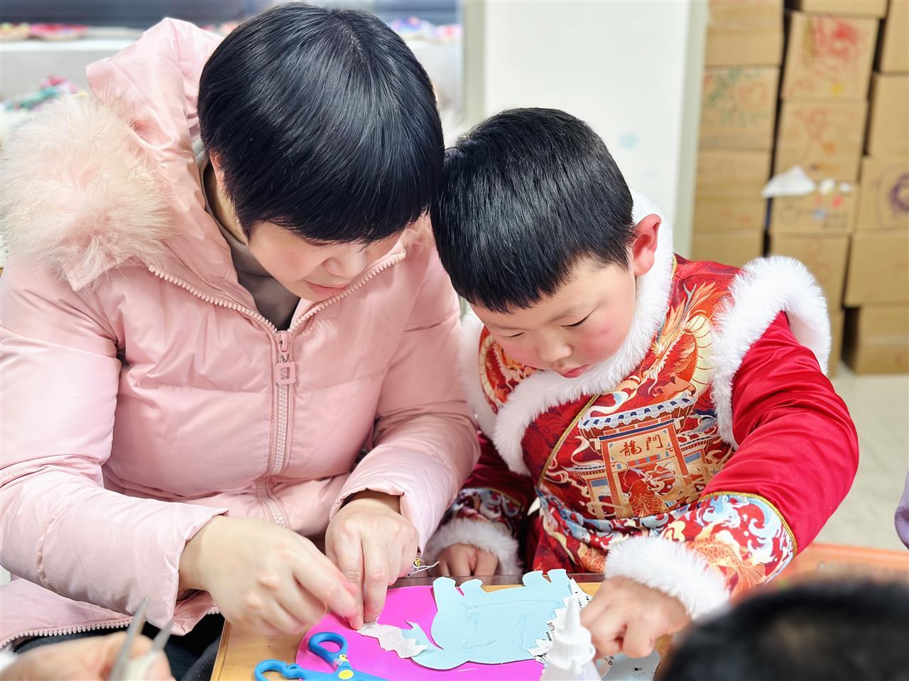 结合园本布艺特色,“布韵小马创意坊”吸引了不少家庭参与。孩子与家长共同剪裁、拼贴布料,制作出形态各异的马年布贴画,童趣满满;“骏年寻福观影会”上,孩子们观看马年主题短片,积极参与问答,在观影中学习传统文化;“贺岁趣夹小挑战”则需要家长抱起孩子,由孩子用脚夹起玩偶完成挑战,协作之中笑声不断。