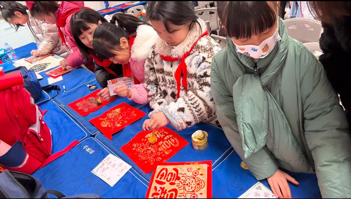 活动现场,孩子们手持 “千禧争章卡” 穿梭于各类特色摊位,开启趣味闯关之旅。非遗圈趣摊位上,孩子们在专注套圈的同时,聆听家长志愿者讲述传统游戏背后的团圆寓意;“字谜灯廊”下,融合学科知识与生活智慧的谜语点燃思维火花;古法拓印工坊里,孩子们亲手操作,孩子们亲手将宣纸覆于雕版,用拓包均匀着墨,让古朴的“福”字、生肖图案在宣纸上显现,触摸传统技艺的温度。每个摊位都化身“品德教室”,让孩子们在游戏中体悟专注、规则与文化自信。