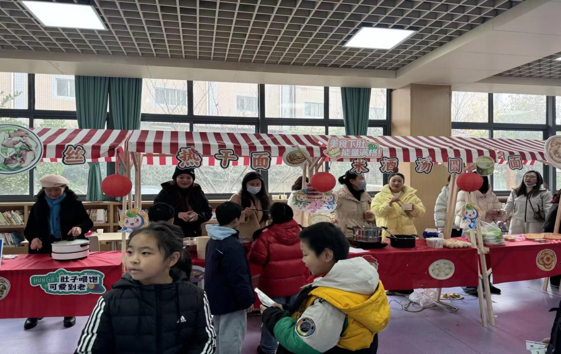 四年级学生化身“美食研究员”,通过成本核算和科学实验,解密“武汉味道”。一碗热干面多少钱?为什么藕汤会拉丝?孩子们用数学算成本,用科学做实验,最后还能用中英文向“顾客”推介。学习变成了美味的研究之旅。四年级在展示当天还请来了各个班的“美妈”和奶奶,为孩子们带来独特的“武汉味道”——豆皮、糯米包油条、铫子煨藕汤、汤圆糊米酒等,让孩子们体会武汉美食的烟火气。