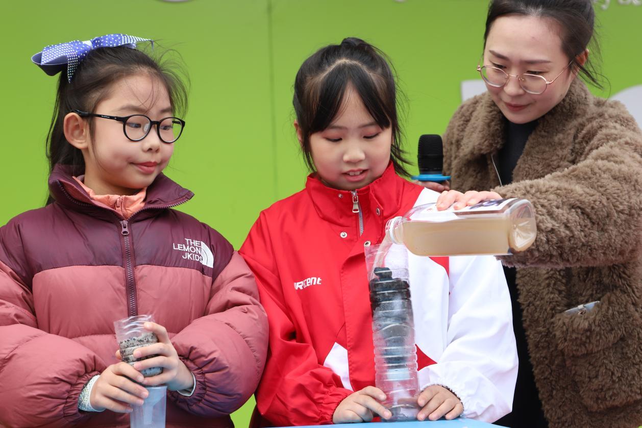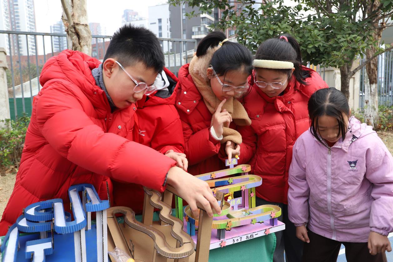 一年级“快乐小马达”展示了自制不倒翁,通过内置重物降低重心,让孩子们在动手实践中感受力学原理;二年级“环保小设计师”将废旧材料改造成炫酷时装,传递“变废为宝”的环保理念;三年级“净水小能手”用简易材料制作过滤器,现场演示污水变清的过程;四年级“工程小达人”展示了液压开合桥,揭秘液压传动原理;五年级“机械小创客”利用废旧物品制作出会动的机器人与小车,展现巧思与动手能力;六年级“力学小高手”则通过结构设计,让薄纸承载重物,演绎“一纸承千斤”的科学奇迹。