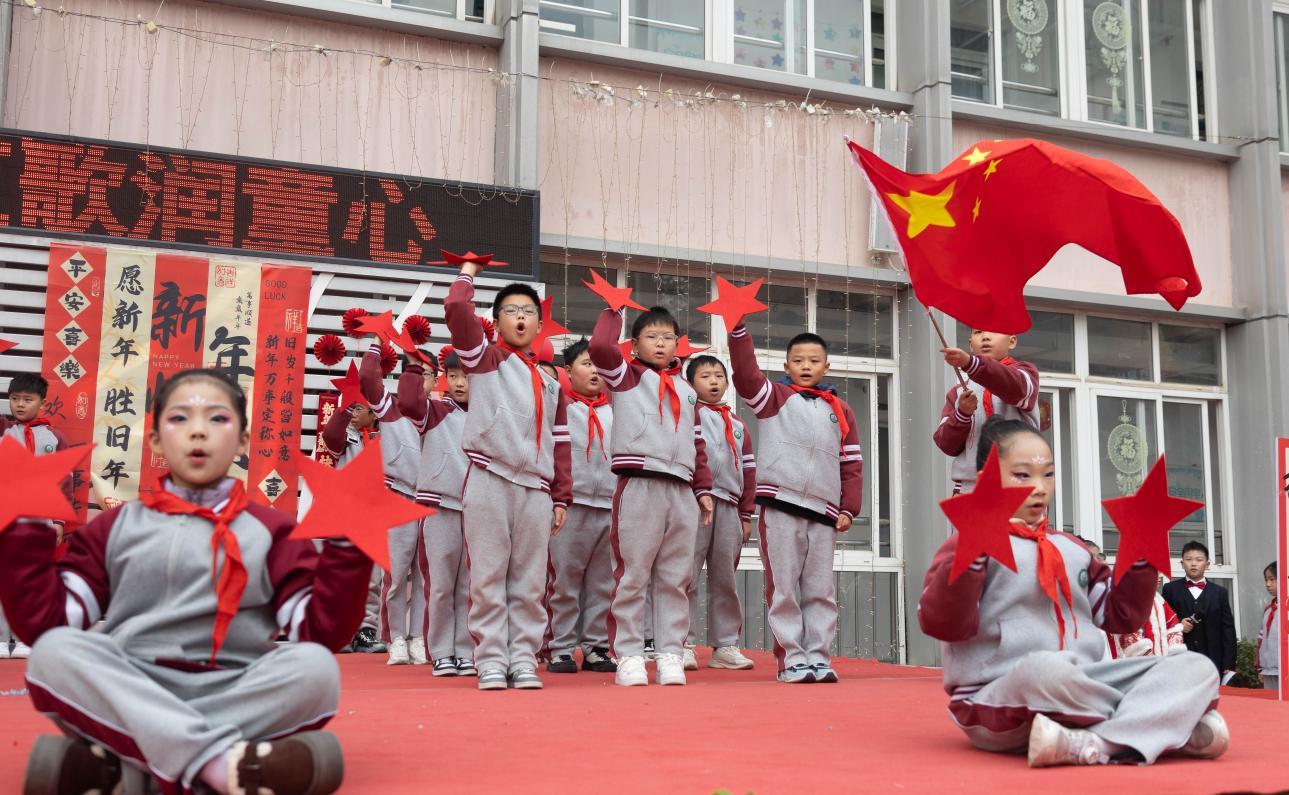 展演在清雅动人的古筝合奏《小美满》中缓缓启幕,琴音如流水般,奏响了新年将至的温馨序曲。整场节目形式多元、内涵深刻:朗诵《中国字、中国人》铿锵有力,一笔一画间彰显文化自信;情景剧《满江红》再现历史风云,激昂壮志感染全场;《万疆》《我爱你中国》等红色经典歌曲,在孩子们纯净的嗓音中传递出深厚家国情怀,表达了对祖国的美好礼赞。
