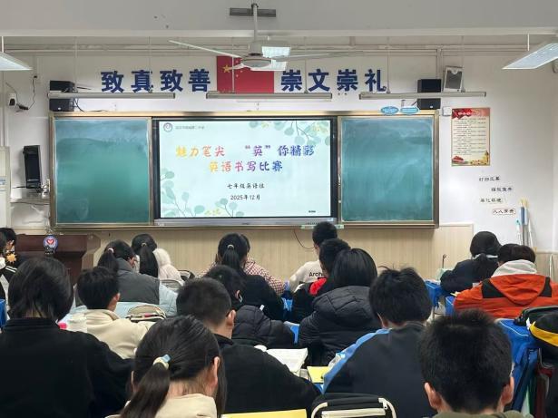 “魅力笔尖 ‘英’你精彩”英语书写比赛中,七年级学子以笔为媒,将规范的字母、流畅的句式与整洁的卷面完美结合。同学们坐姿端正,一笔一划认真书写,有的选择经典英语美文,有的摘抄励志名言,字迹或娟秀工整,或刚劲有力。“为了这次比赛,我每天坚持临摹英语字帖20分钟,不仅想拿好成绩,更想让自己的书写更规范。”获得书写一等奖的702班的陈文婷同学展示着自己的作品。担任评委的英语教研组长张晓聪老师点评道:“同学们的书写整体水平较高,卷面整洁度和字母规范性都有明显进步,不少作品已经具备书法美感,这背后是日常的坚持与积累。”