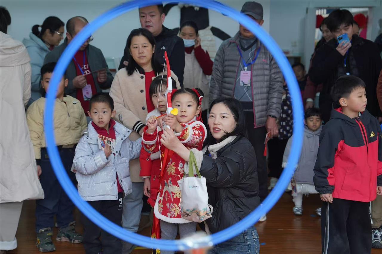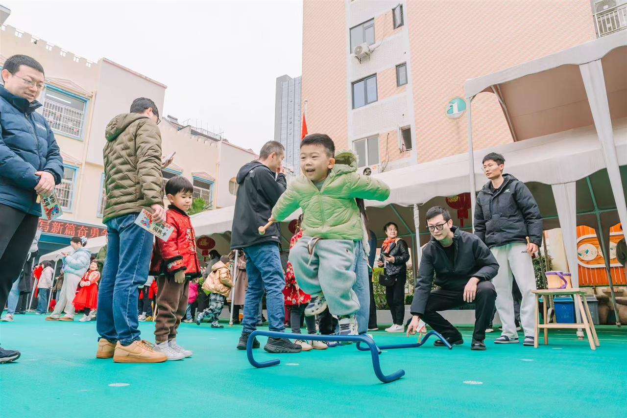 活动围绕“荆楚文化”展开,分为室内工坊和室外游戏两大区域。教室内,孩子们和家长一起参与“福球传吉运”“青铜·抛彩缶”“楚娃射宝”等互动项目;户外则设有“蹴鞠跃福门”“编钟跑跑乐”“荆楚寻宝记”等趣味竞技游戏。每个项目完成可获得印章,集章过程中,欢声笑语不断。