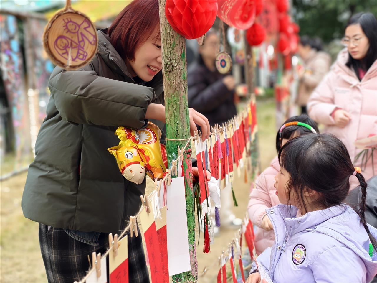 在“福气大闯关”区域,套圈赢“福”菜、小马运“福”粮、接力夹“福”娃等游戏吸引了不少家庭参与。家长和孩子协作闯关,既锻炼了身体,也增进了默契,现场欢笑声不断。“福艺大创作”板块中,孩子们在家长陪伴下动手做簪花、制福袋、绘福画,亲身体验劳动的乐趣与创造的成就感。