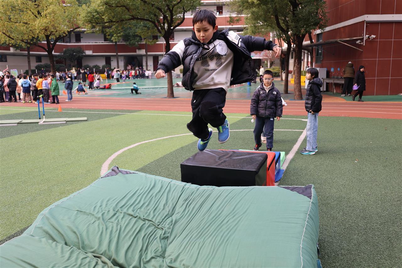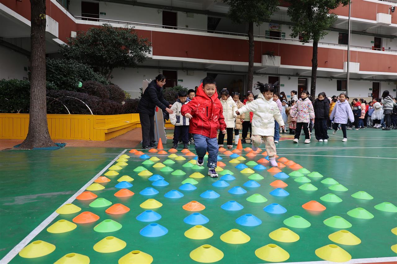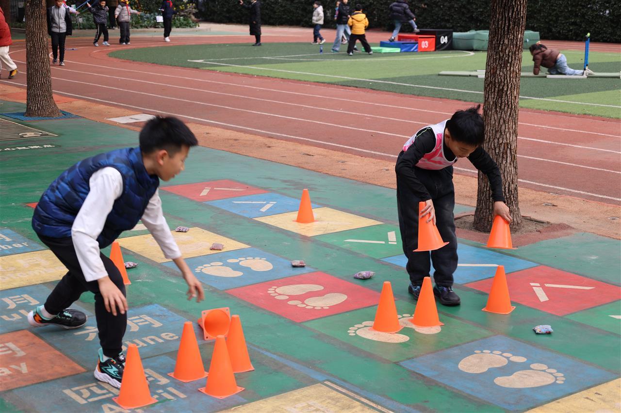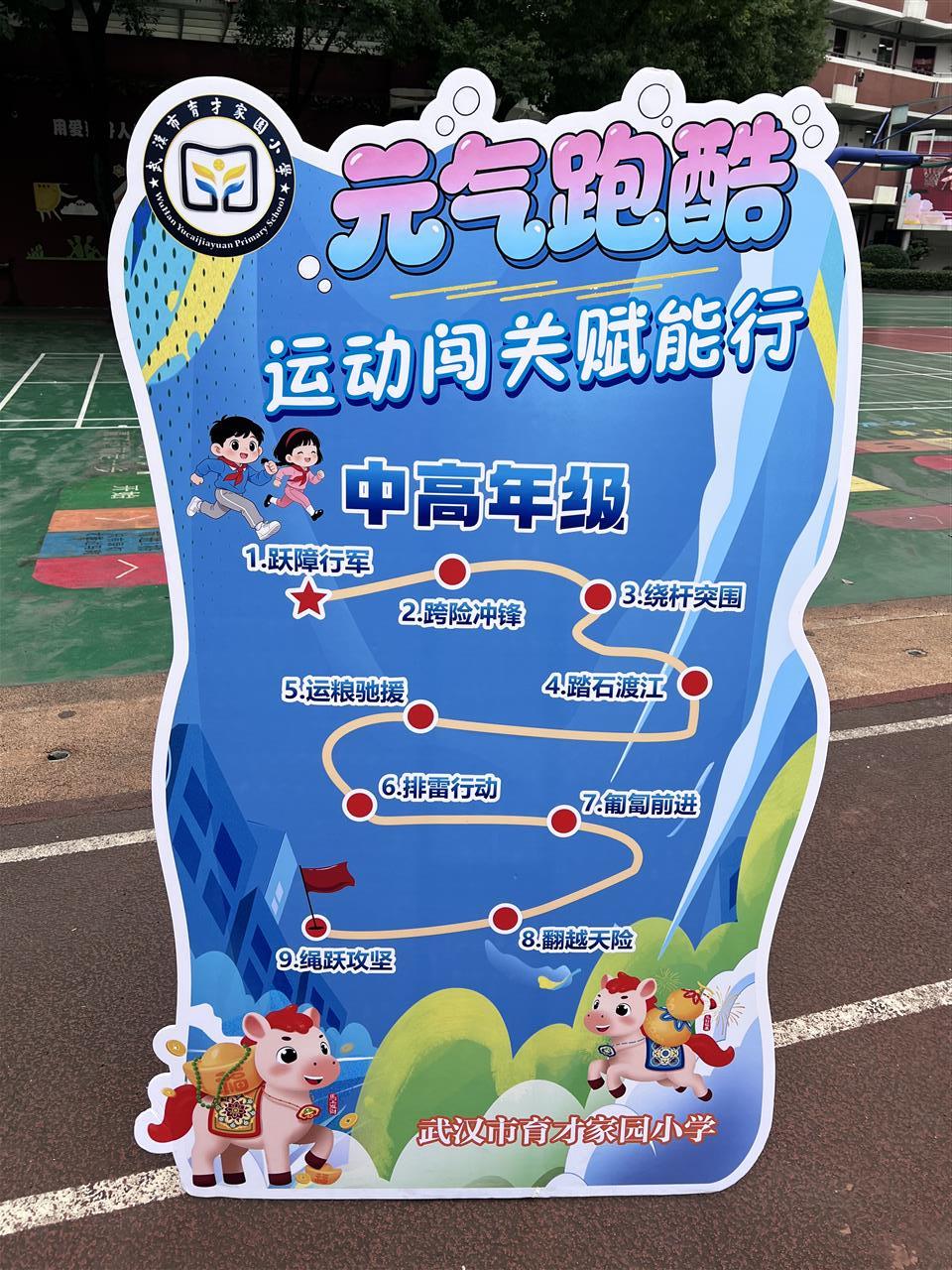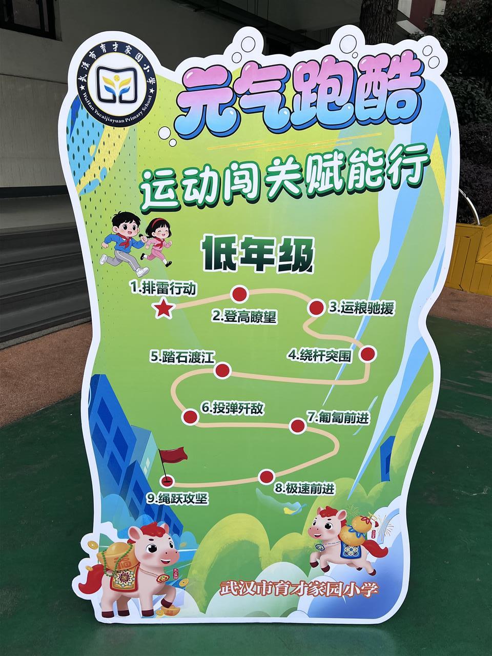 “欢迎来到‘元气跑酷’运动闯关挑战,请同学们按路线图逐一闯关哟!”2025年最后一天,一踏入武汉市育才家园小学,篮球场早已热闹喧腾,排雷行动、匍匐前进、绕杆突围等趣味项目轮番上演,攀爬、跳跃、投掷,同学们身影穿梭,铆足干劲冲刺终点,欢声笑语洒满赛场。