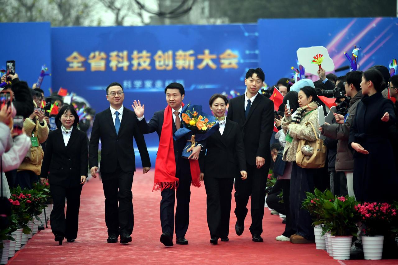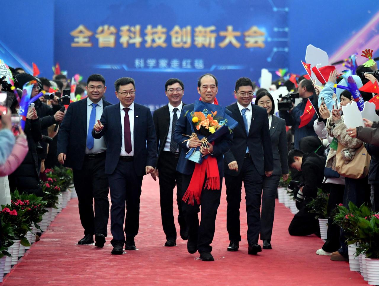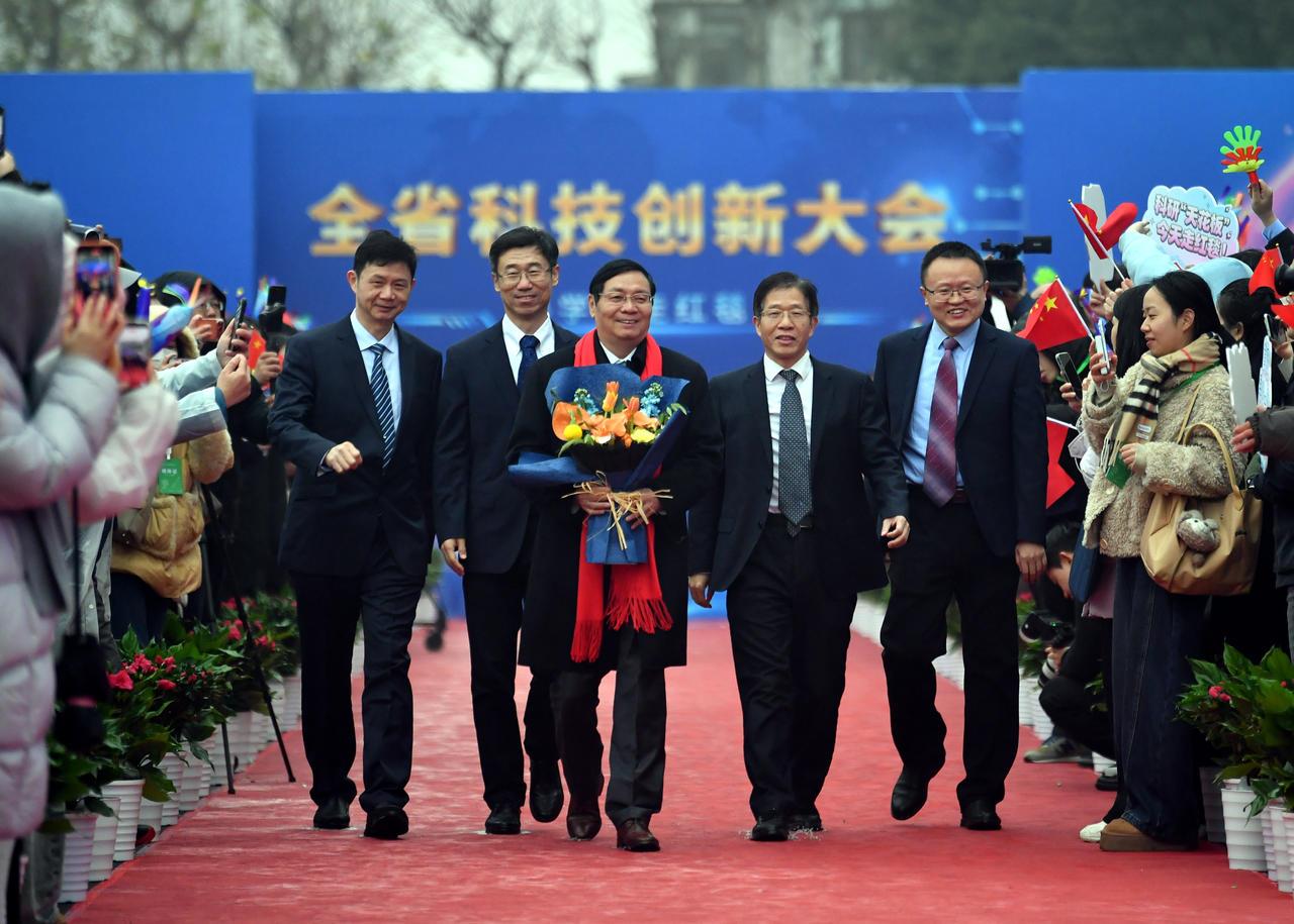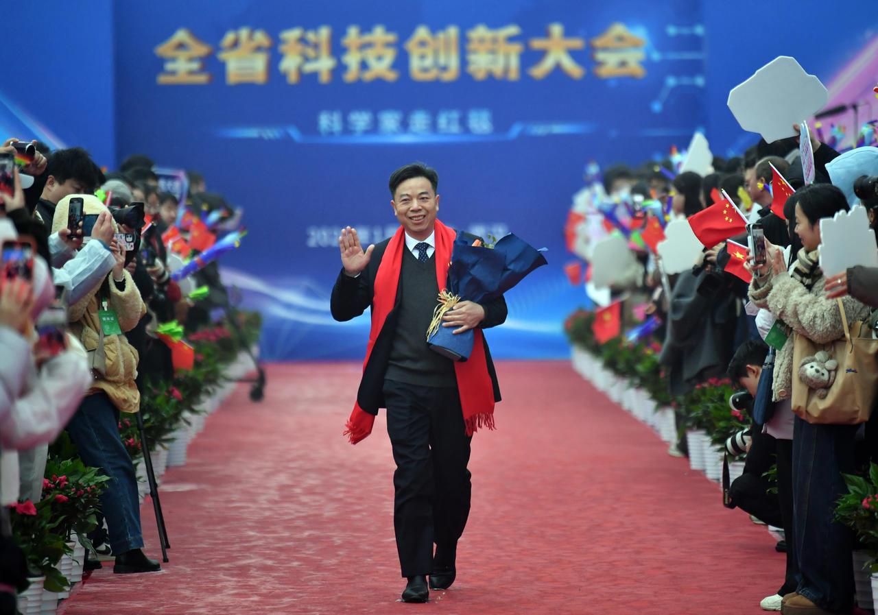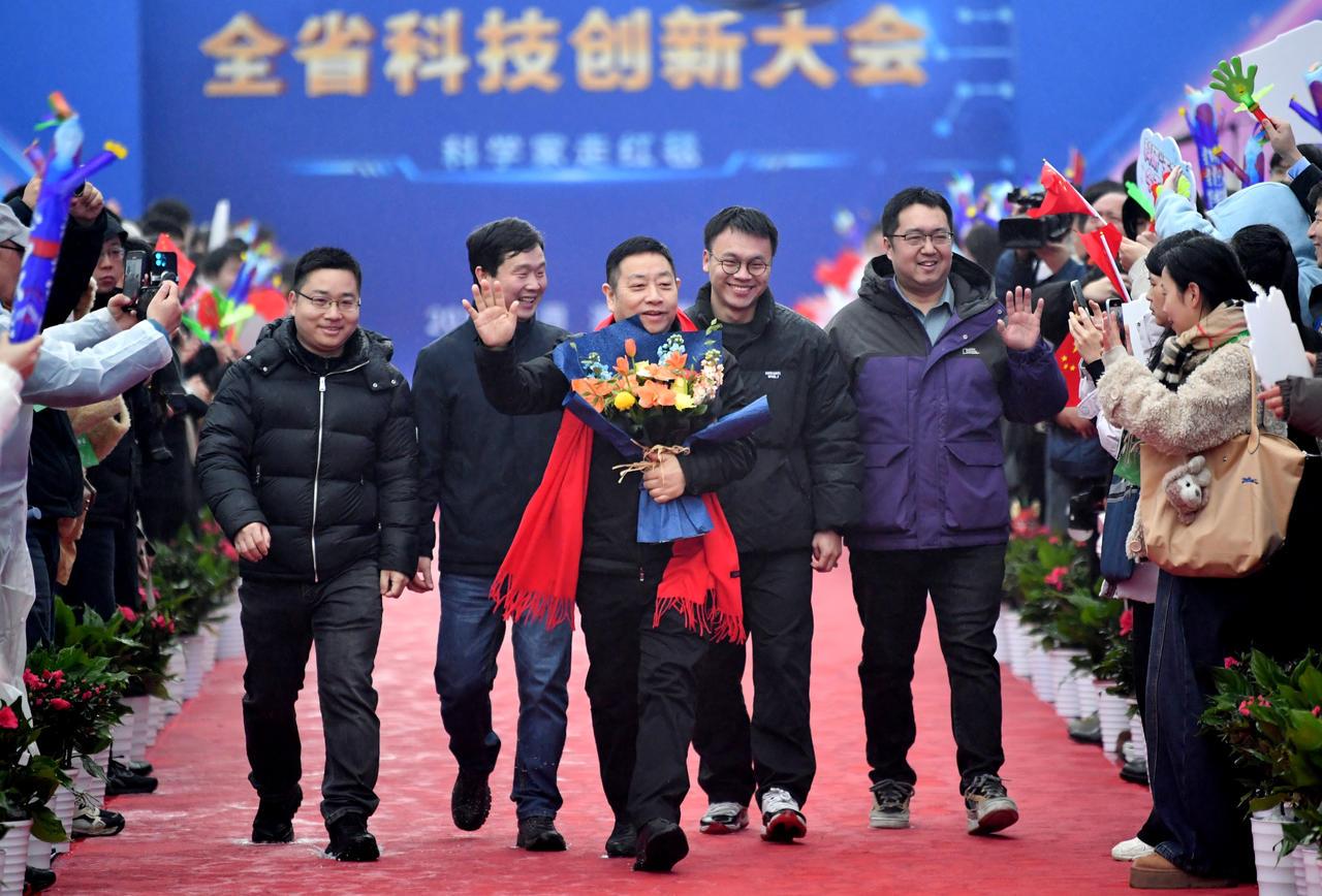 1月4日上午,2026年湖北省科技创新大会在武汉洪山礼堂拉开序幕。活动现场,上百米长的红毯从洪山路的一侧一直延伸到礼堂内。红毯两侧,鲜花簇拥。今年的红毯上依旧“群星璀璨”,8位院士与4位杰出学者组成的“科学之星”队伍步伐从容,闪耀登场,展现出湖北省科技创新的蓬勃气象。