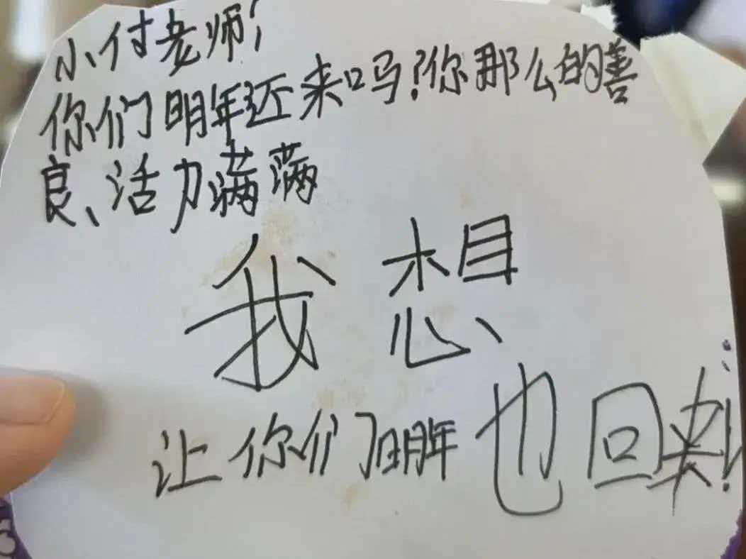抵达王铺村后,她很快进入“付老师”的角色:每天早上,她会提前到教室,帮孩子们整理书桌;上课时,她用浅显易懂的语言讲英语单词,用小游戏教数学计算,还会给孩子们讲自己在军营的故事,鼓励他们勇敢追梦;下课后,她成了孩子们的“大朋友”,陪他们跳皮筋、玩跳绳,听他们讲家里的小事。支教结束的那天,孩子们没有像往常一样闹着玩,而是悄悄围了过来。一个小女孩从口袋里掏出一张皱巴巴的纸条,塞到她手里,小声说:“付老师,这是我写的。”付艳秋展开一看,上面用歪歪扭扭的字写着:“小付老师,你们明年还来吗?你那么善良、活力满满。我想让你们明年也回来!”那一刻,她的眼眶瞬间湿润了——两周的时间很短,但这份来自孩子们的牵挂,却成了她这个夏天最珍贵的礼物。“原来付出真心,真的会收获最纯粹的感动。”她说,这次支教让她更懂得责任与奉献的意义。
