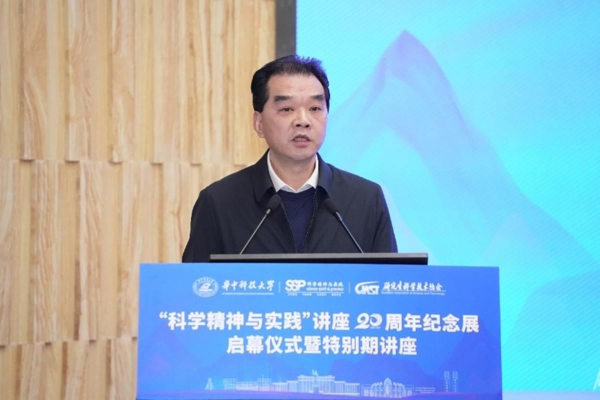 朱志斌在致辞中充分肯定了华科大对推动湖北省建设科技创新高地作出的重要贡献,细数了双方在弘扬科学家精神、培育青年人才、共建科普品牌等方面的合作成果。他强调,校地协同是激发创新活力、弘扬科学家精神的重要驱动,希望学校持续发挥品牌优势,培养更多具有科学精神的创新人才。
