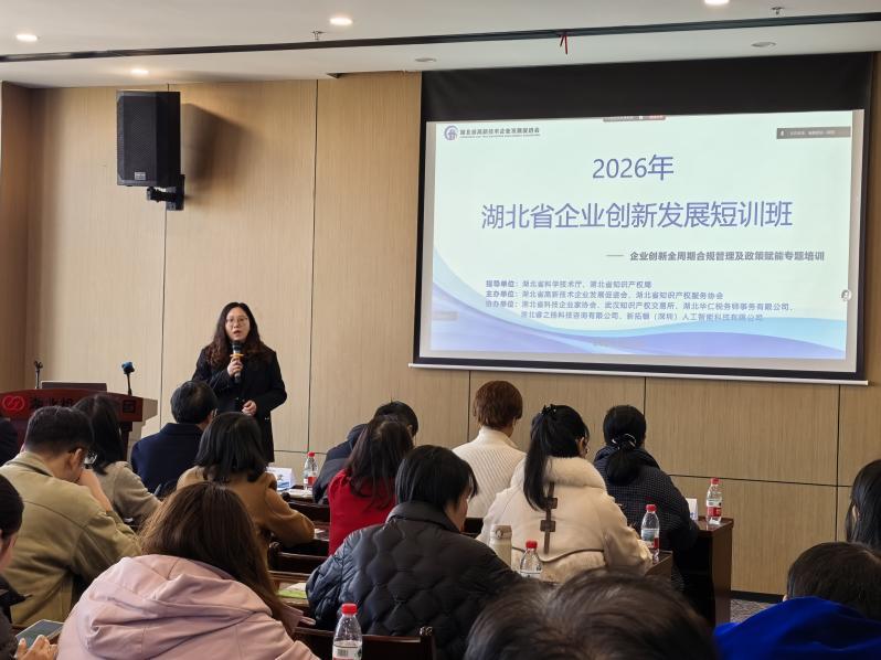 1月9日,由湖北省科学技术厅、湖北省知识产权局指导,湖北省高新技术企业发展促进会、湖北省知识产权服务协会主办的“2026年湖北省企业创新发展短训班”在武汉宸胜中心成功举办。本次短训班以聚焦科技创新与知识产权,聚焦创新合规与政策赋能,通过系统化、实战化的课程设计,为企业厘清创新路径、防控研发风险、提升资源获取能力,助力企业实现可持续、高质量发展。
