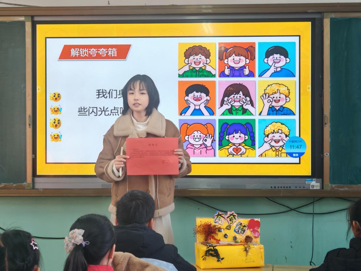 “夸夸箱里藏着‘爱的魔法’,孩子们写下同学的闪光点,在匿名分享中传递温暖、增强自信。”周老师介绍道。在“解锁夸夸箱”环节,同学们认真写下自己过去一年的成长,并互相抽取“夸夸卡”,“你很乐于助人”“你的执行力很强”“数学进步很大……”同学眼中的真诚赞美,让许多孩子重新认识了自己。501班的易昊然同学既惊喜又有些害羞:“有些优点,我自己都没发现。”周老师及时引导大家,善于发现他人长处是一种美德,悦纳自己、肯定自我同样重要。