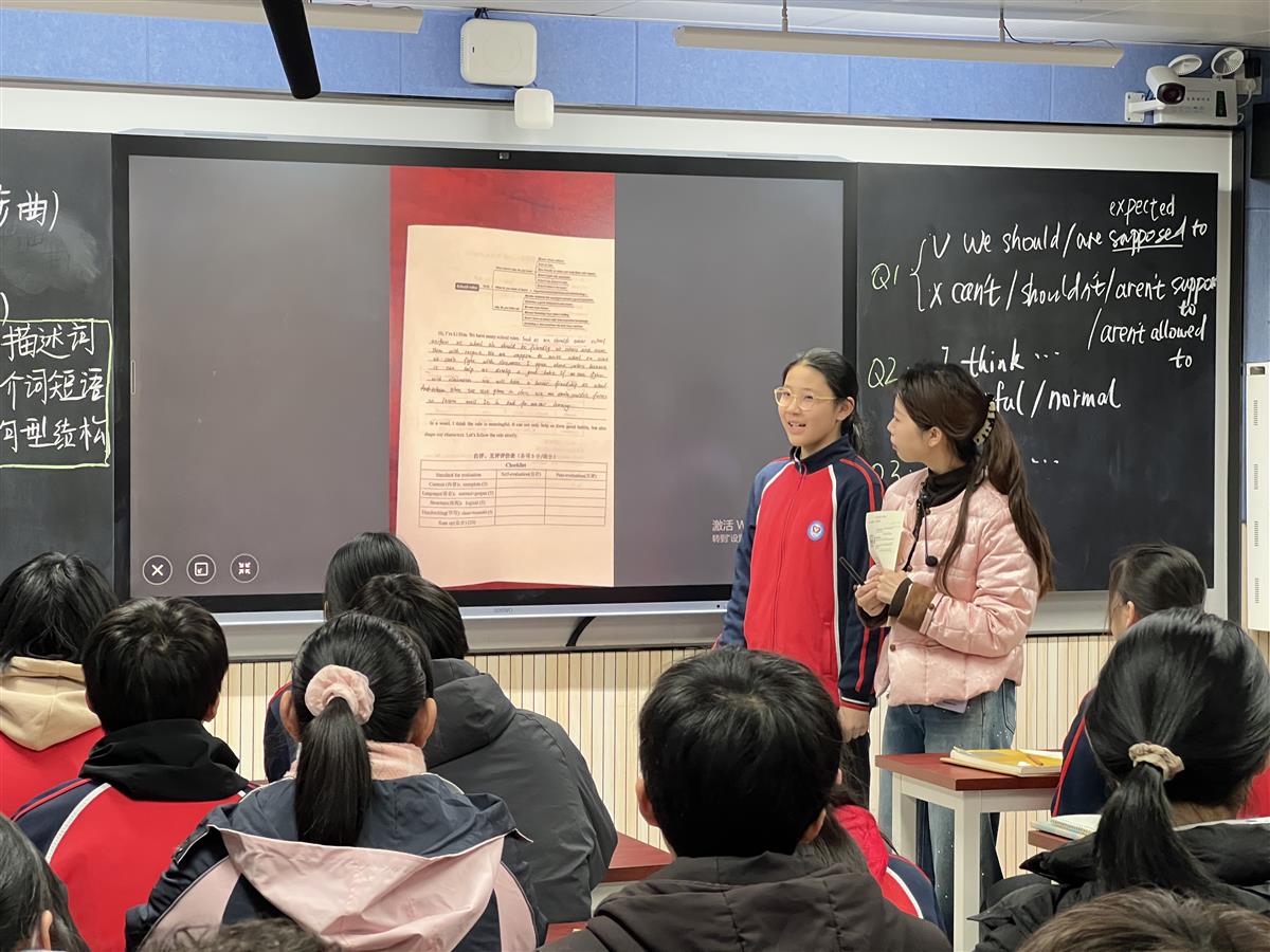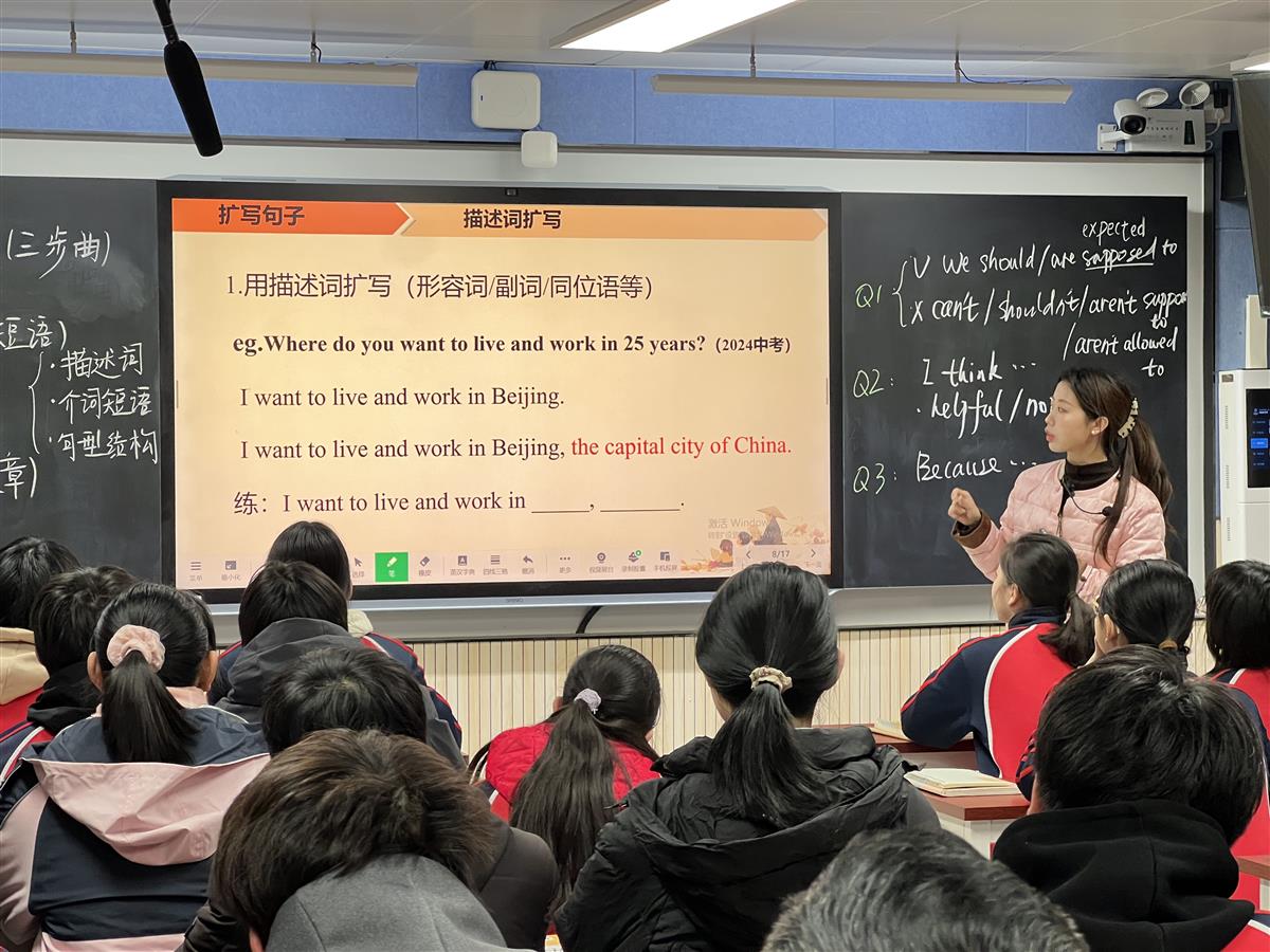 活动中,第四十九初级中学青年教师张倩为钢城二中九年级学生带来了一堂精彩的书面表达复习示范课。本节课以“School rules”为主题,围绕“What school rules do you have? What do you think of them? Why do you think so?”的写作问题,设计了四步教学法:立足词和词组积累素材,依托描述词、介词短语、句型结构扩写句子,运用总分总框架搭建文章,最后通过学生作文展示与互评深化学习效果。这堂目标明确的示范课成效显著,助力基础薄弱的学生提升写作能力,写出了内容充实的作文,实现了明显进步。
