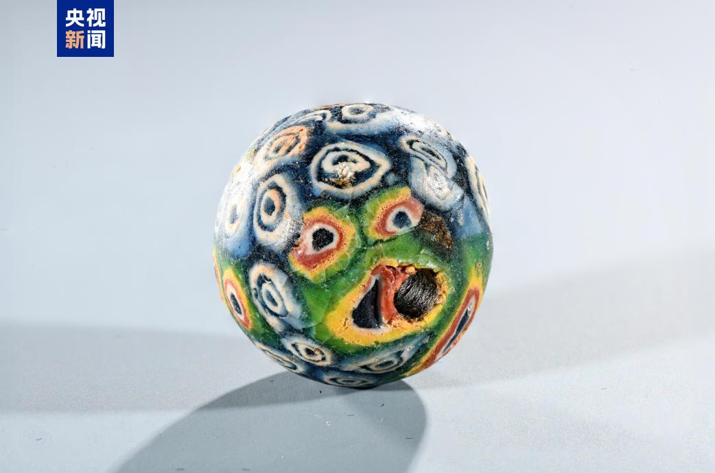 △南朝 ·玻璃珠,广州市文物考古研究院(南汉二陵博物馆)藏。这类多色玻璃珠的制作采用了马赛克工艺,是古罗马和地中海地区流行的玻璃工艺和装饰风格传播至爪哇后,被当地玻璃工匠吸收并融合创新制作出来的Jatim珠。广州出土的这类珠子与当时的海上贸易有着密切关系。