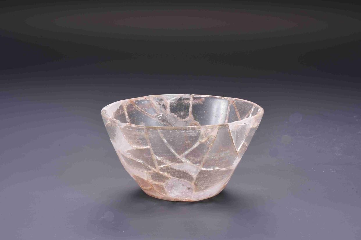 △西汉·无色透明玻璃杯,广州市文物考古研究院(南汉二陵博物馆)藏。经检测,其材质为中等钙铝型钾玻璃。中等钙铝型、低钙高铝型最早发现于印度,后向东沿海岸传播,主要出土于我国的广东、广西地区。