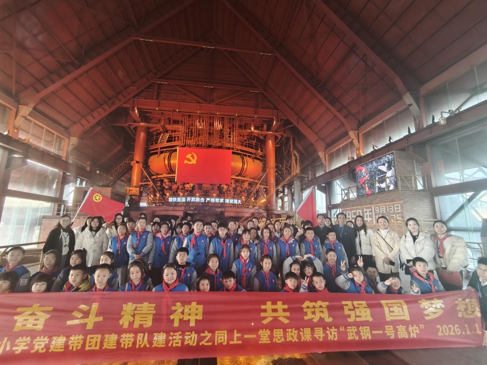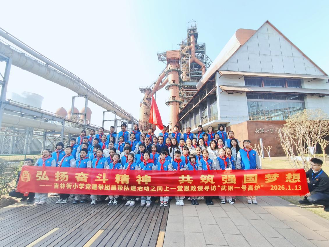 为深入贯彻党带队、党带团工作机制,厚植师生家国情怀,2026年1月13日下午,武汉市青山区吉林街小学党总支带领党员教师、团员教师及少先队员代表,走进武钢一号高炉景区,开展“弘扬奋斗精神 共筑强国梦想”主题教育,让工业红色基因在少年心中生根发芽。