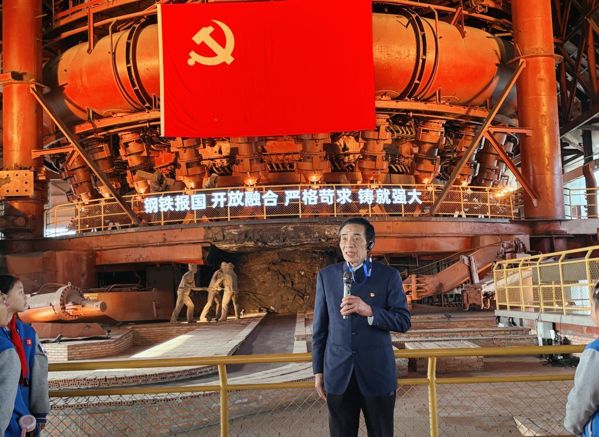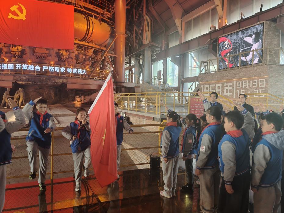 仪式环节更是将活动推向高潮。在“党建带队建”篇章,老党员胡昇爷爷带着岁月的厚重指着高炉的方向,以亲身经历为少先队员讲述武钢一号高炉的建设故事,工人们在设备简陋、条件艰苦的情况下,靠着“一穷二白也要干出钢铁厂”的信念,日夜奋战攻克难关,最终让一号高炉顺利出铁的故事。朴实的语言、真挚的情感,让孩子们读懂了“奋斗”二字的重量。少先队员代表301班蓝文俊登台分享感悟,“我们生长在衣食无忧的年代,珍惜现在,像老一辈奋斗者那样迎难而上……”稚嫩的嗓音里满是“强国有我”的坚定决心,响亮的少先队呼号在高炉园区久久回荡。