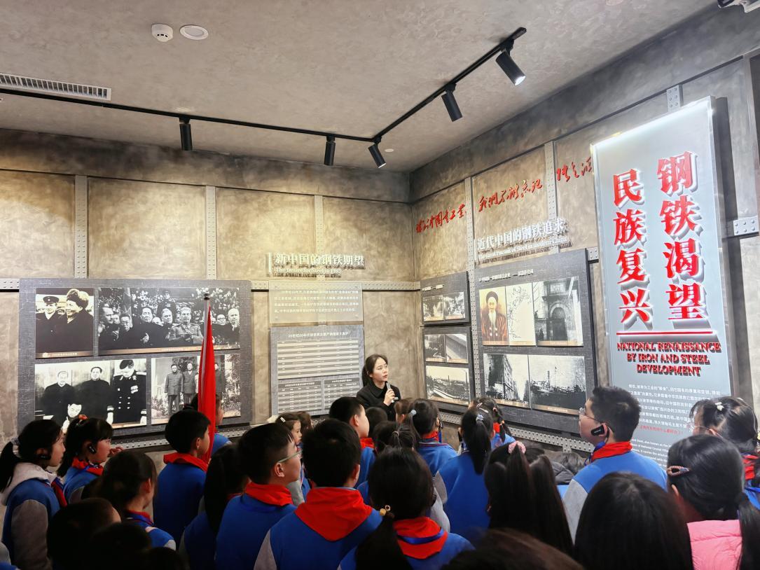 钢铁熔炉旁,历史回响间。在景区讲解员的引导下,师生们先后参观武钢一号高炉一楼展厅与二楼生产区域,从一张张老照片、一件件旧设备中,追溯武钢从建厂初期的艰苦创业到现代化发展的辉煌历程,沉浸式感受老一辈武钢人“战天斗地、敢为人先”的奋斗精神。斑驳的高炉壁镌刻着工业记忆,铿锵的讲解声勾勒出奋斗图景,孩子们不时驻足记录,眼中满是对钢铁前辈的敬佩。
