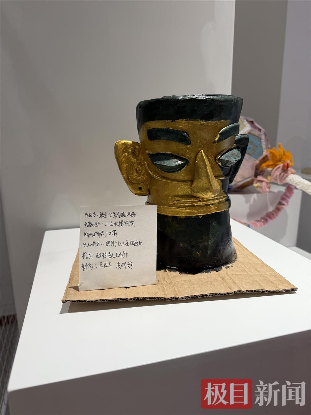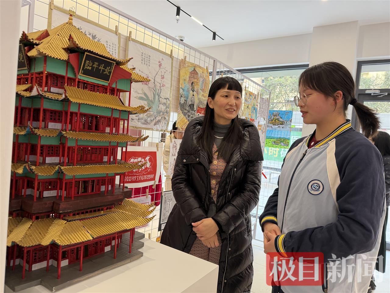 步入展厅左侧,一座高约半米的黄鹤楼微缩模型尤为醒目。灯光点亮时,楼内壁画上的白鹤振翅欲飞,门窗榫卯清晰可见。制作者黄子山是2023级学生,新闻记者了解到,从去年暑假起,他利用课余时间,用牛奶盒、木棍等材料,制作微缩版的黄鹤楼。