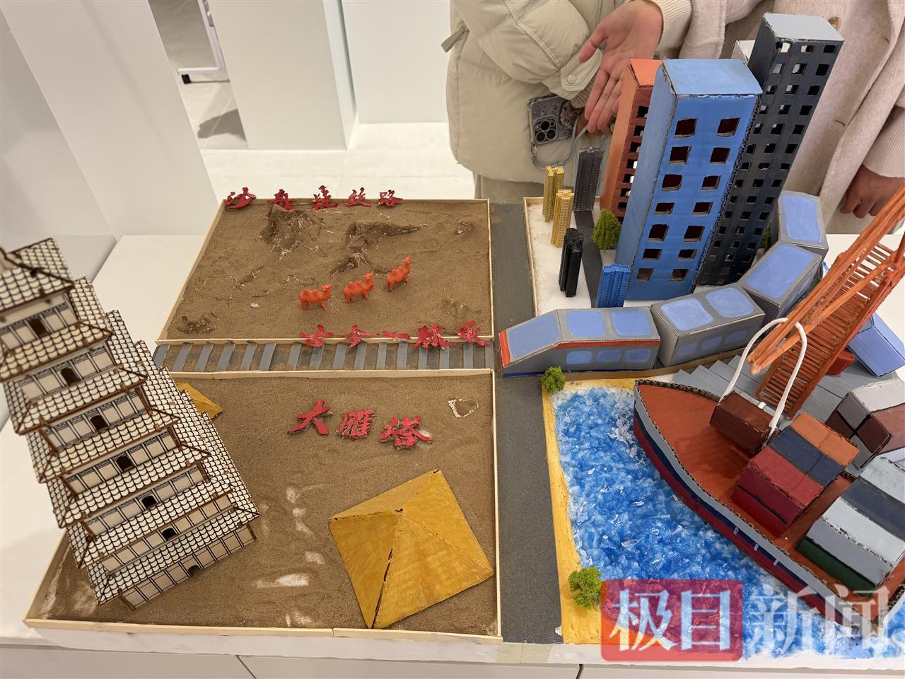 不远处,电子商务专业学生制作的“一带一路”主题微缩沙盘,以直观方式演绎着古今交汇:左侧,大雁塔下驼队缓行,古船扬帆,重现陆上与海上丝绸之路的往日盛景;右侧,高铁飞驰、港口集装箱林立,展现新时代的贸易脉动。