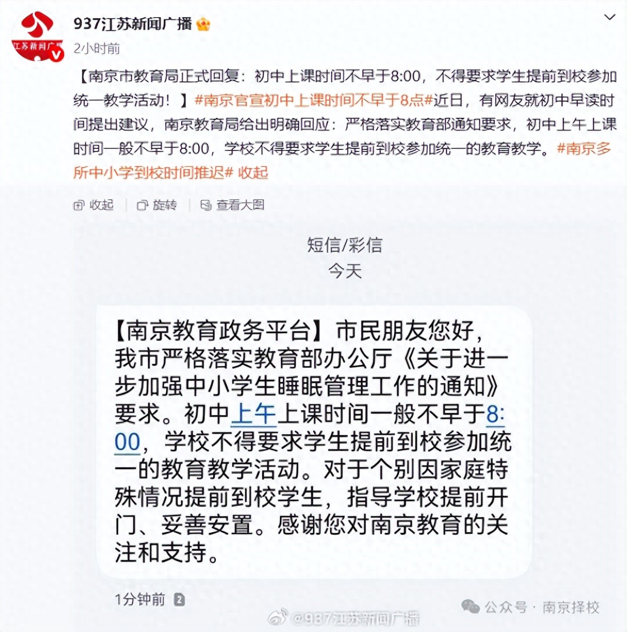 据江苏新闻广播消息,南京教育局给出明确回应:严格落实教育部通知要求,初中上午上课时间一般不早于8:00,学校不得要求学生提前到校参加统一的教育教学活动。
