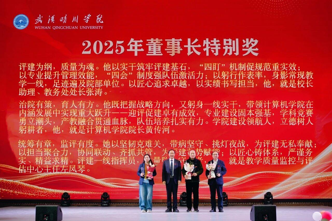 大会隆重表彰了过去一年在教学科研、迎评促建、招生就业、人才培养等各项工作中表现突出的先进集体和个人。其中,校长助理兼教务处处长张涛、计算机学院院长黄传河、教学质量监控与评估中心主任左凤琴获2025年度“董事长特别奖”。