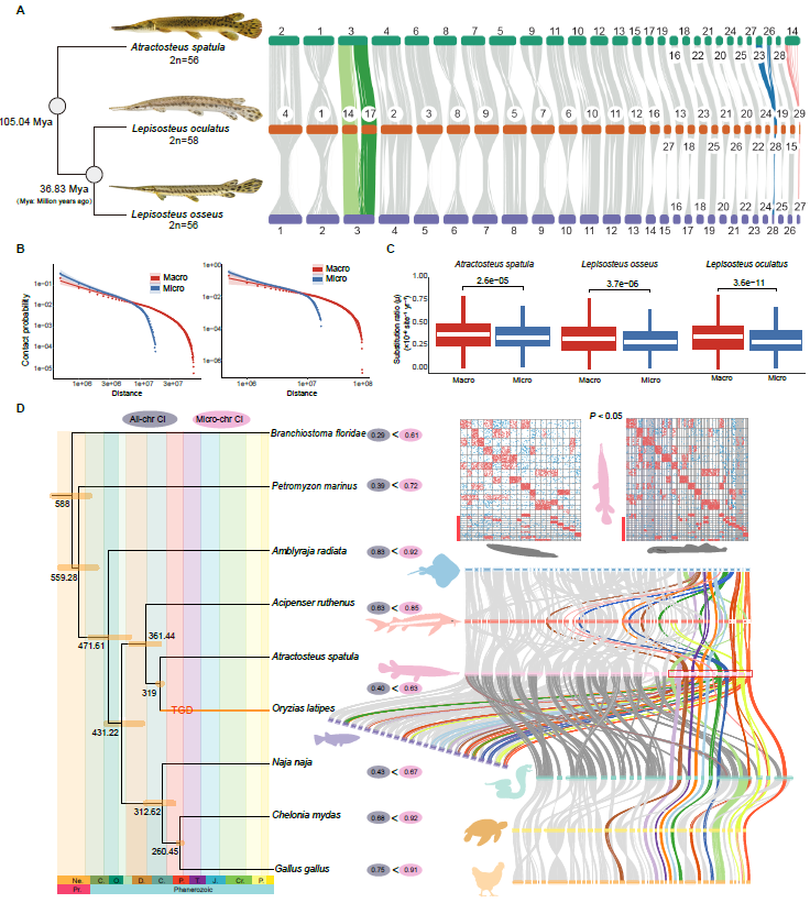 研究团队首先给两种雀鳝——鳄雀鳝和长吻雀鳝,绘制了高精度的“基因地图”(染色体级基因组)。研究发现,两个属的鱼类虽然在1亿多年前就分化了,但依然有83.35%的基因组完全一致。而且它们基因组大小的差异甚微,几乎都是因为个别碱基的“插入”或“缺失”,并没有发生大规模的结构重组。更妙的是,雀鳝体内的“小染色体”比“大染色体”更稳定,上面还集中了很多负责DNA修复、细胞凋亡的基因,能够帮雀鳝维持基因稳定。研究发现,“活化石”雀鳝基因演化速率极其缓慢,染色体重排率仅约0.5次/百万年;其与四足动物的基因组相似度甚至高于近缘的真骨鱼类;而且它们转座元件(又被称作“跳跃基因”)的产生率与活跃度,在脊椎动物中最低。科学家推测,这些都是维持基因组稳定性的重要原因。