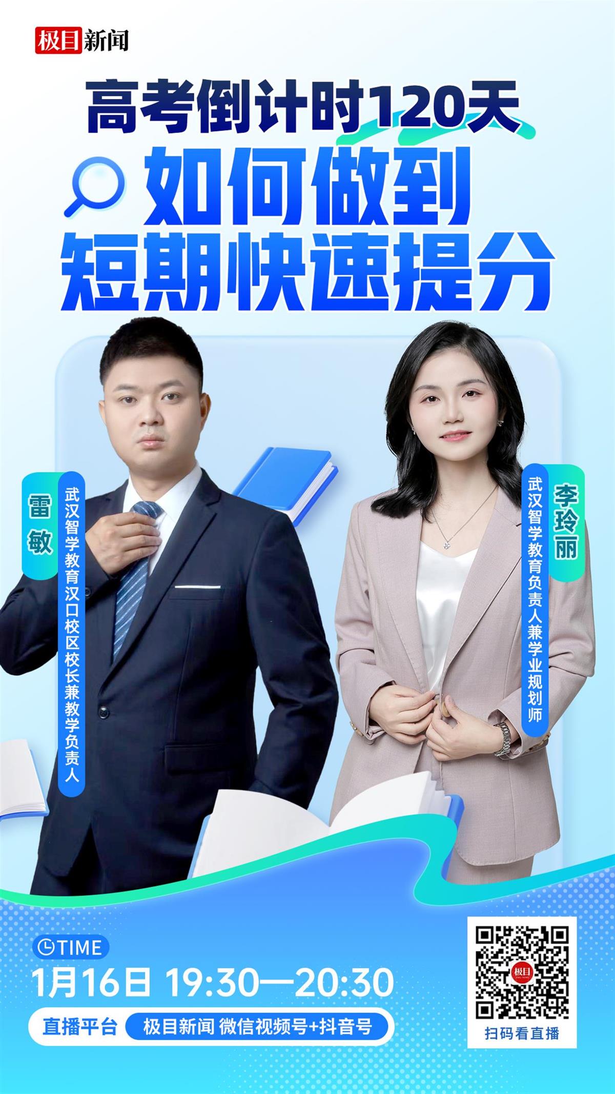 1月16日19:30—20:30,武汉智学教育负责人兼学业规划师李玲丽、武汉智学教育汉口校区校长兼教学负责人雷敏将坐镇直播间,针对艺考生数学基础薄弱、备考时间紧张的痛点,分享高频考点梳理技巧、题型拆解方法与快速提分策略,同时为考生量身定制联考后分阶段备考规划,助力艺考生扫清文化课冲刺障碍。