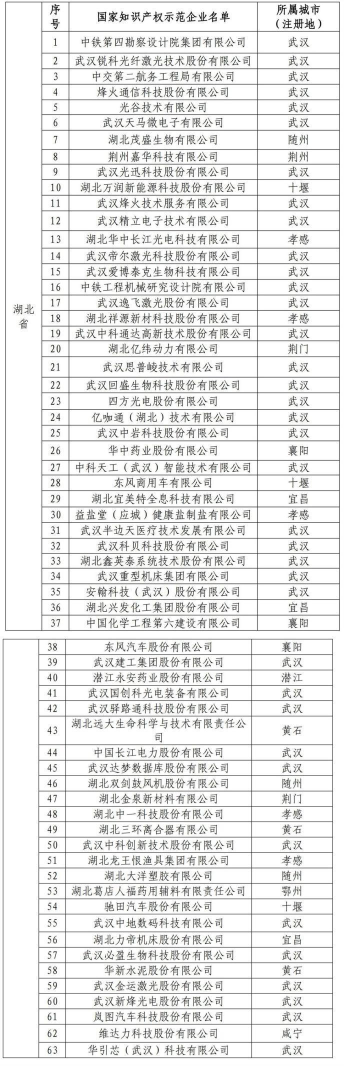1月12日,国家知识产权局公示了新一批国家知识产权强国建设示范企业创建对象名单,湖北省共有63家企业成功入选,全国排名第7。彰显了湖北在高质量知识产权创造、运用和保护方面的显著成效。