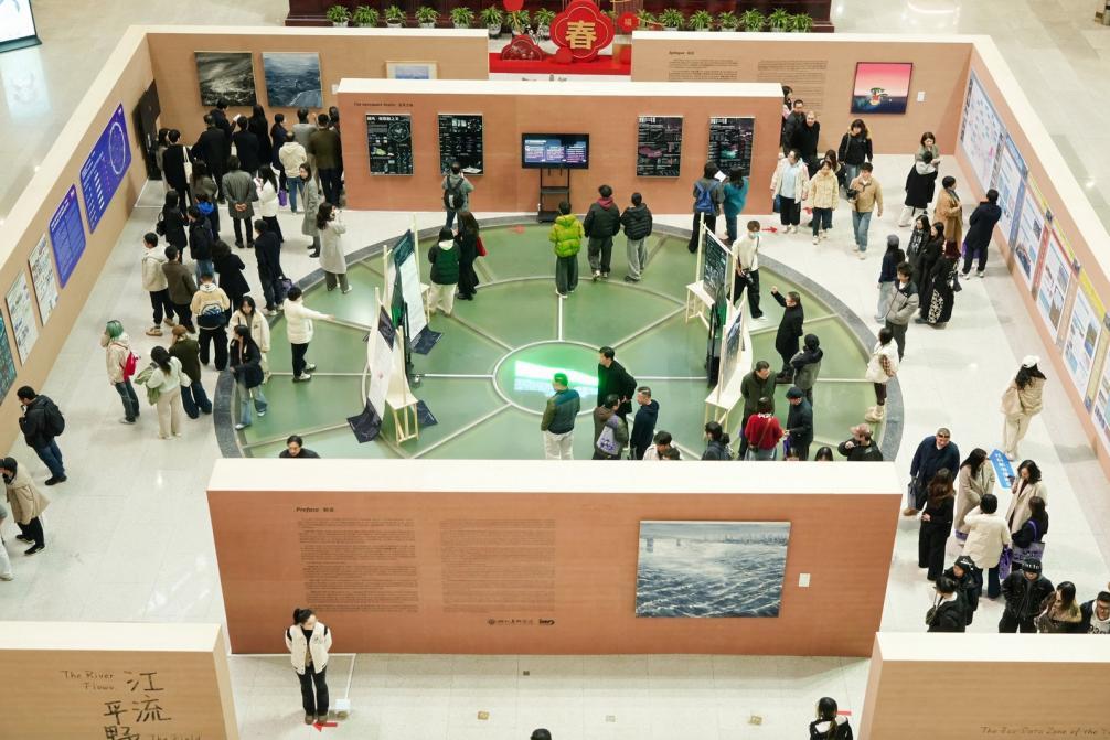 1月16日下午,“江流平野 · 长江生态数据之境”主题展览在湖北省图书馆盛大开幕。为积极响应“深入实施美丽湖北战略,为支点建设提供坚实生态环境支撑”的号召,本次展览以长江生态为主题,通过生态数据与艺术设计的深度融合,呈现长江流域生态文明建设的科学成果与人文思考。展览由“生态之境”“空天之境”“创新之境”三大单元构成,共系统展出27件(套)作品,并特别设有融合科技元素的数据可视化互动体验展区。展览由湖北美术学院创新学院与湖北省图书馆联合主办,湖北美术学院党委宣传部、科研创作处及中国科学院水生生物研究所水生生物博物馆提供支持。