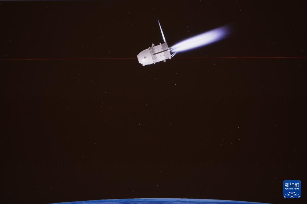 1月19日在北京航天飞行控制中心拍摄的神舟二十号飞船发动机制动的模拟画面。