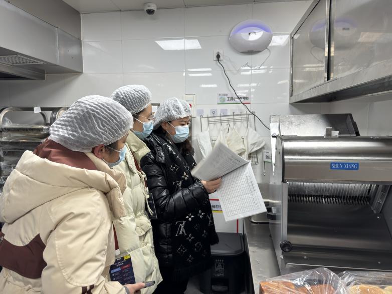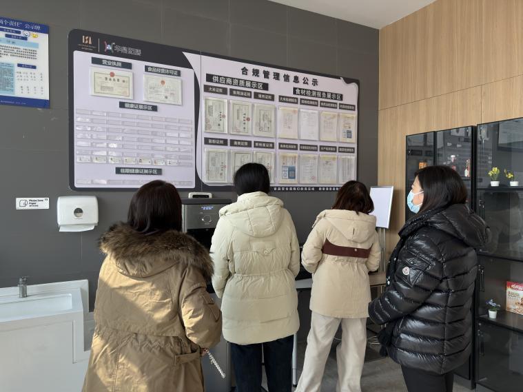 检查组一行抵达后直奔食堂后厨关键区域,重点核查食材采购验收记录、食品储存条件、餐具消毒流程、从业人员资质及食品安全管理制度落实等情况。在食材储存区,米、面、油、蔬菜、肉类等原材料分类分温存放,保质期与溯源凭证一目了然,工作人员介绍道:“学校坚守‘食材新鲜安全’核心原则,建校以来餐饮安全实现‘0事故’,从源头杜绝安全隐患。”这一成果,正是学校“高标准办学理念”在后勤保障中的生动落地。在操作间,生熟分区、厨具专用、人员着装规范等要求严格执行。从业人员均持有健康证明及专项培训证书,细致规范的操作流程获得代表委员的认可。