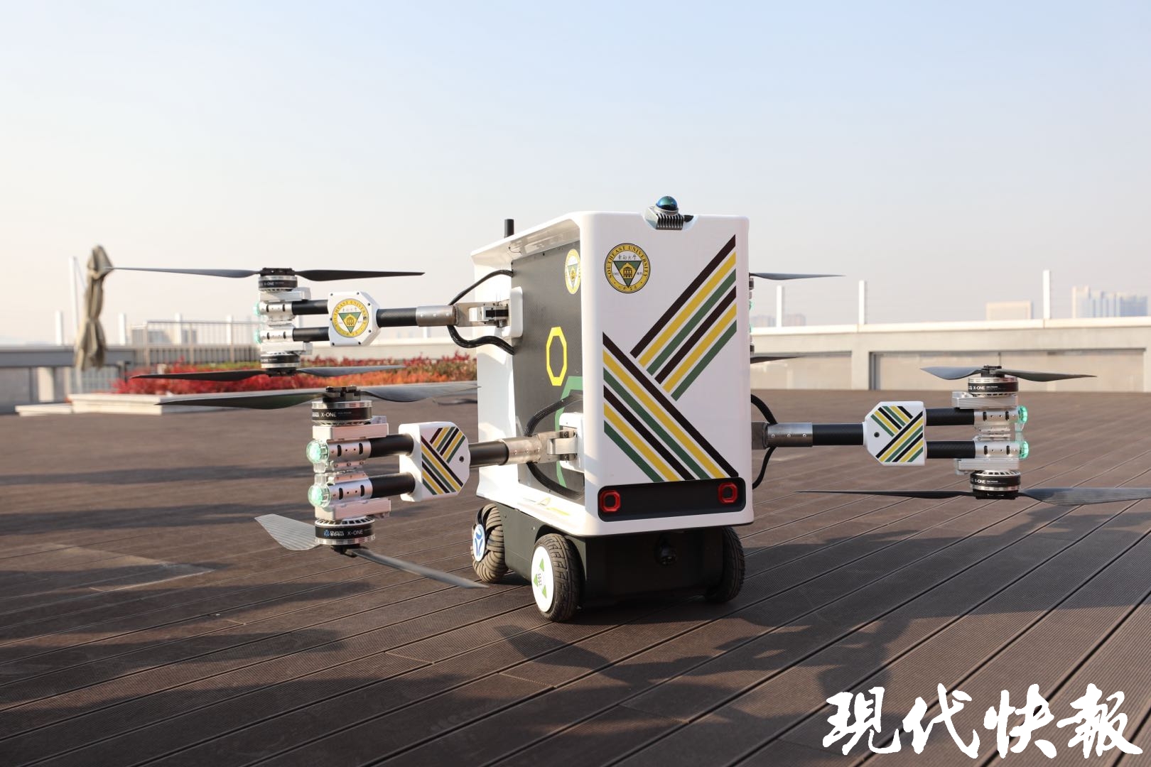 相较于去年发布的“东大·鲲鹏1号”,这款“升级版”更轻便小巧,机臂可折叠,可更自由、灵活地切换飞行、行驶等不同模式。