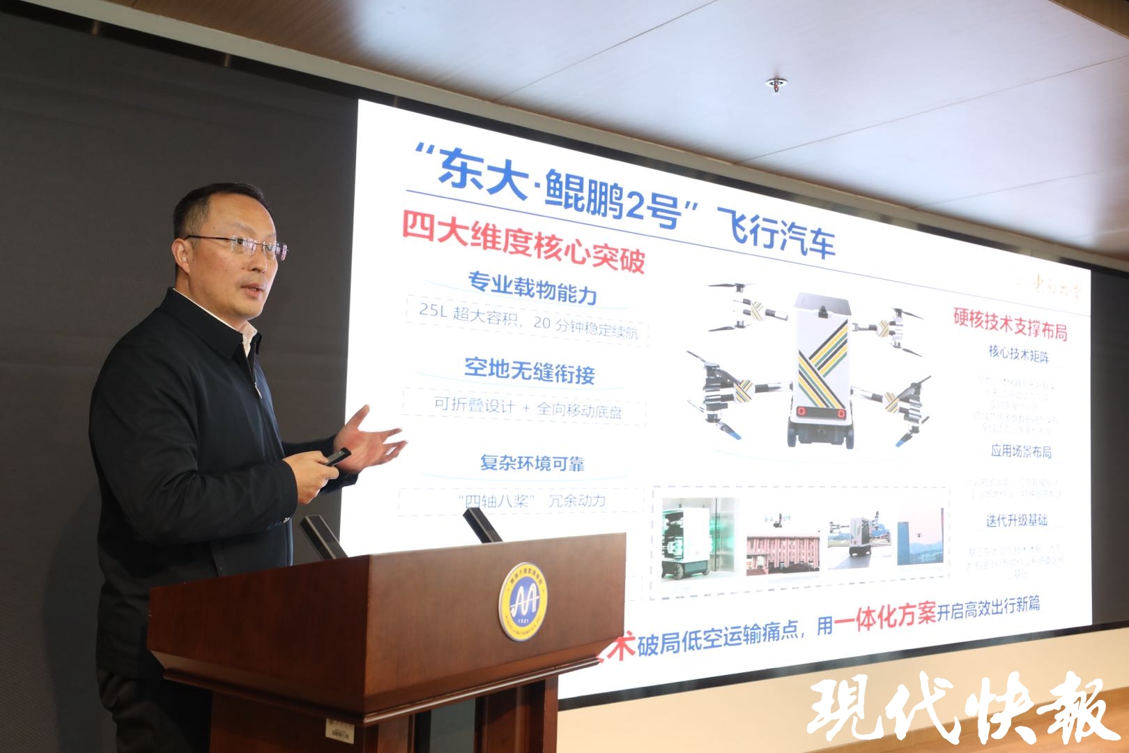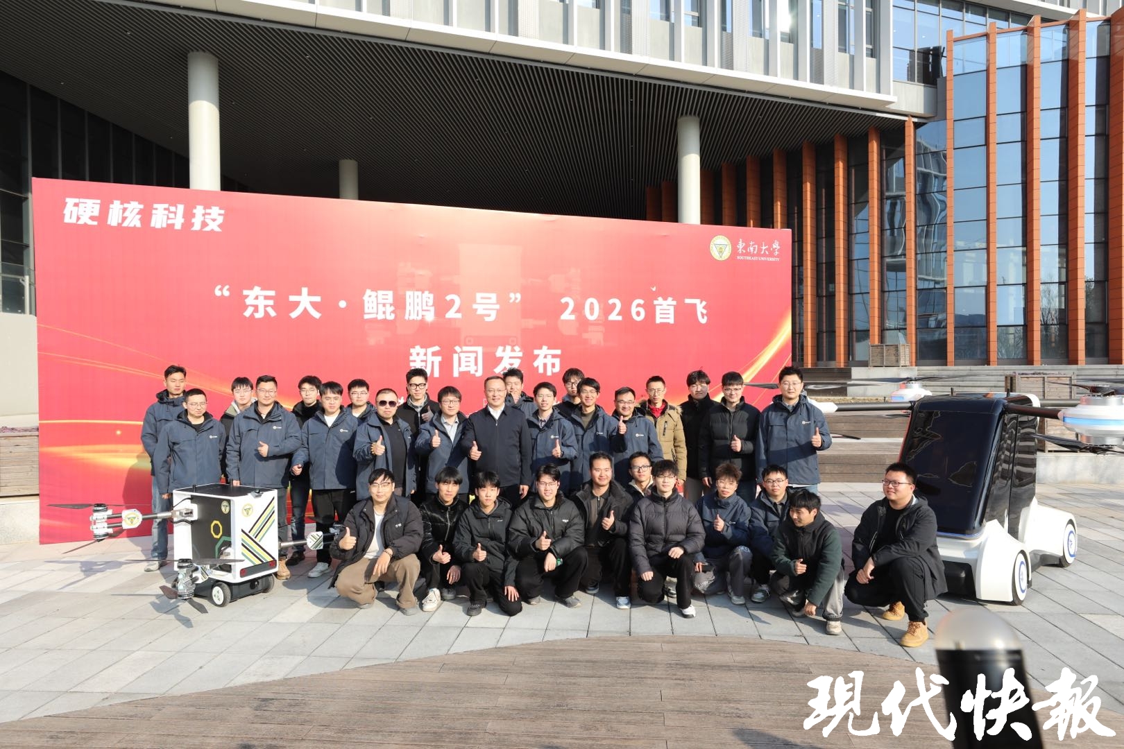 1月23日,东南大学九龙湖校区湖畔,一辆飞行汽车缓缓升空,越过粼粼湖面,在众人屏息注视下,稳稳降落在对岸三江楼五楼的户外平台上。随着舱门开启,一封红色信封映入众人眼帘,东南大学首席教授、飞行汽车科研团队负责人殷国栋打开信封,道出了这款“空地一体”硬核装备的设计初心:“让飞行汽车走出实验室,成为应对运输、应急等实际场景的可靠工具。”这就是东南大学全新推出的“东大·鲲鹏2号”飞行汽车。
