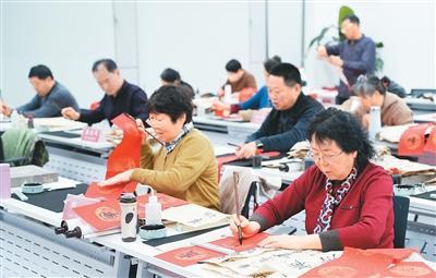 北京市朝阳区老年教育培训机构千尺学堂的书法教室,学员正在学写春联。受访企业供图