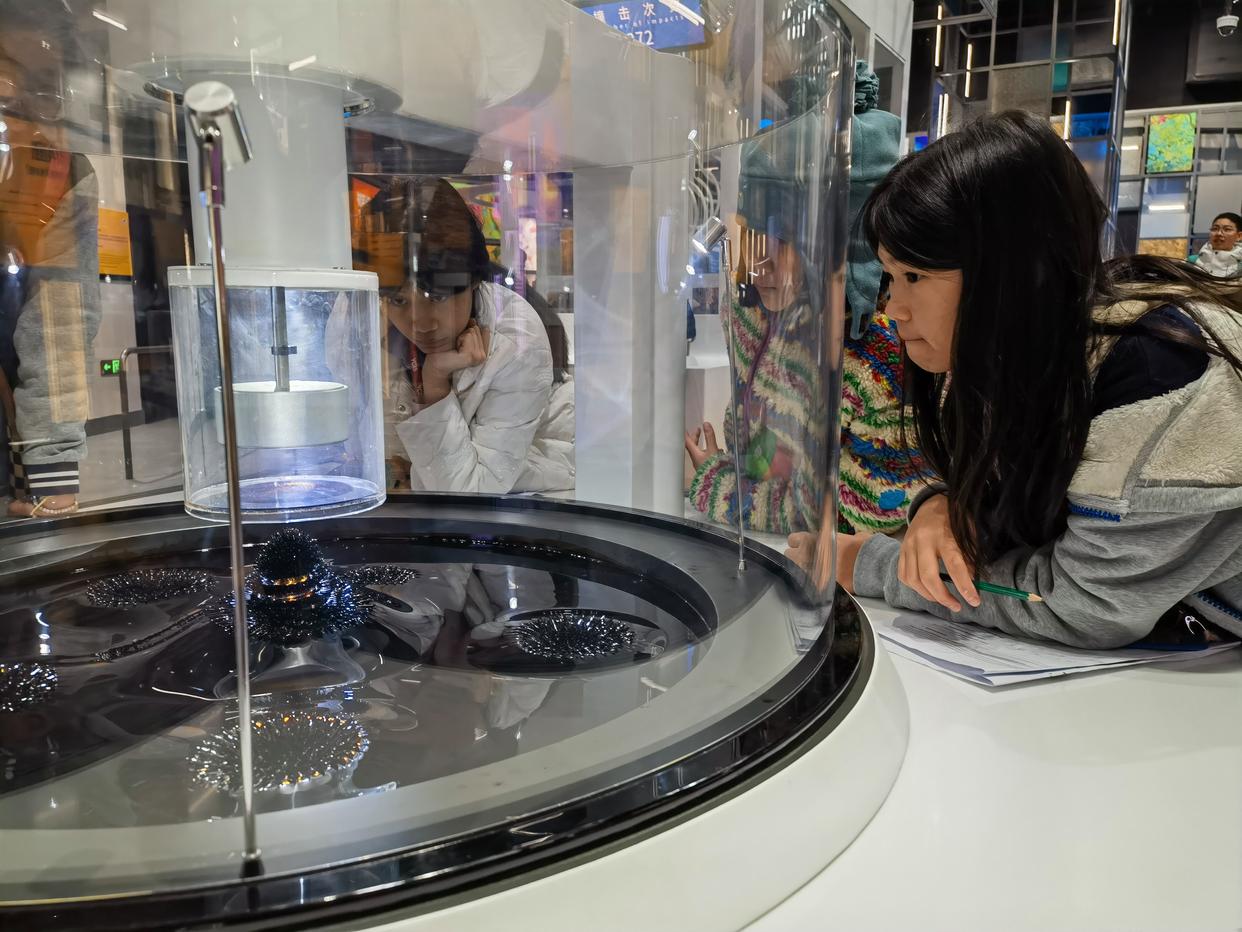1月27日,观众在上海科技馆“材料魔方”展区通过“磁流体芭蕾”了解带有磁性的流体材料。新华社记者 陈爱平 摄 “90后”观众季嫣然是一名文博爱好者,27日她第一次走进上海科技馆。球幕影院放映的科普电影《苍穹》和映前秀《万户飞天》让她倍感震撼,“中国古人探索追月和如今人们探索太空的场景呼应着,让我感受到科技与历史文化发展始终密不可分。”她说。