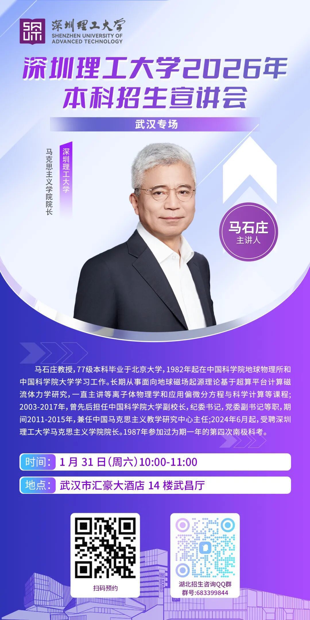 1月28日,新闻记者从深圳理工大学获悉,1月31日深圳理工大学将举办2026年本科招生宣讲会——武汉专场。届时,深圳理工大学马克思主义学院院长马石庄将介绍学校办学情况、在湖北招生政策等。具体时间为1月31日(星期六)10:00-11:00。地点在武汉市汇豪大酒店14楼武昌厅。