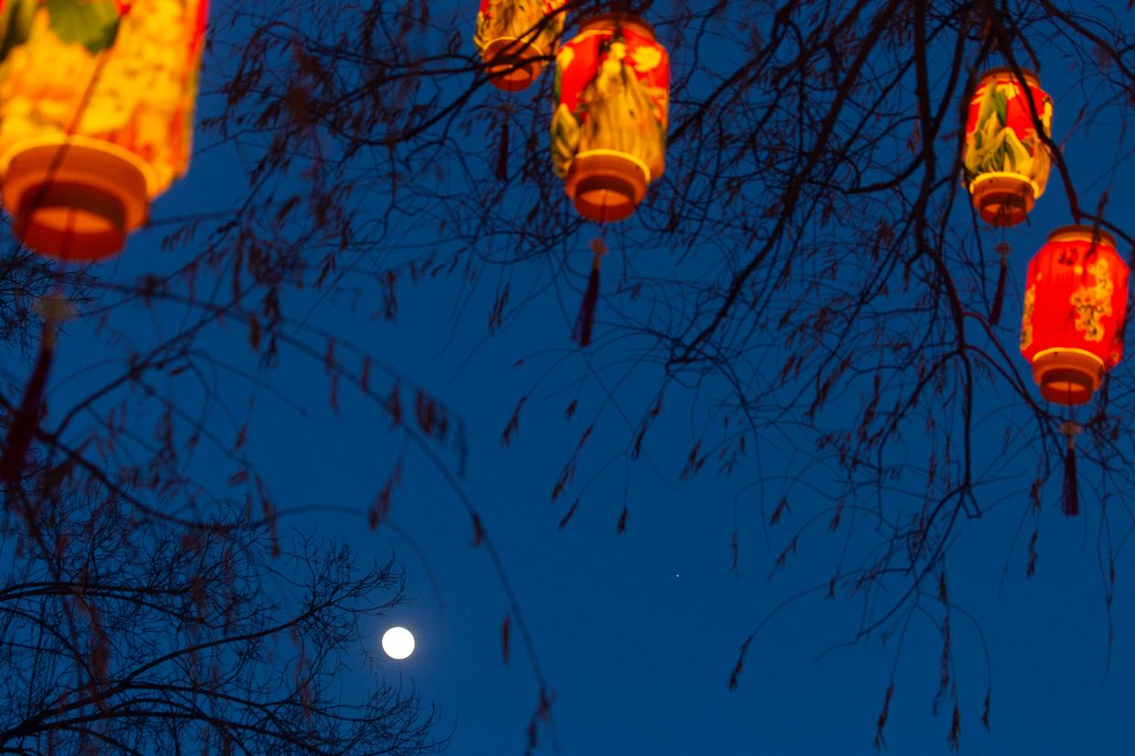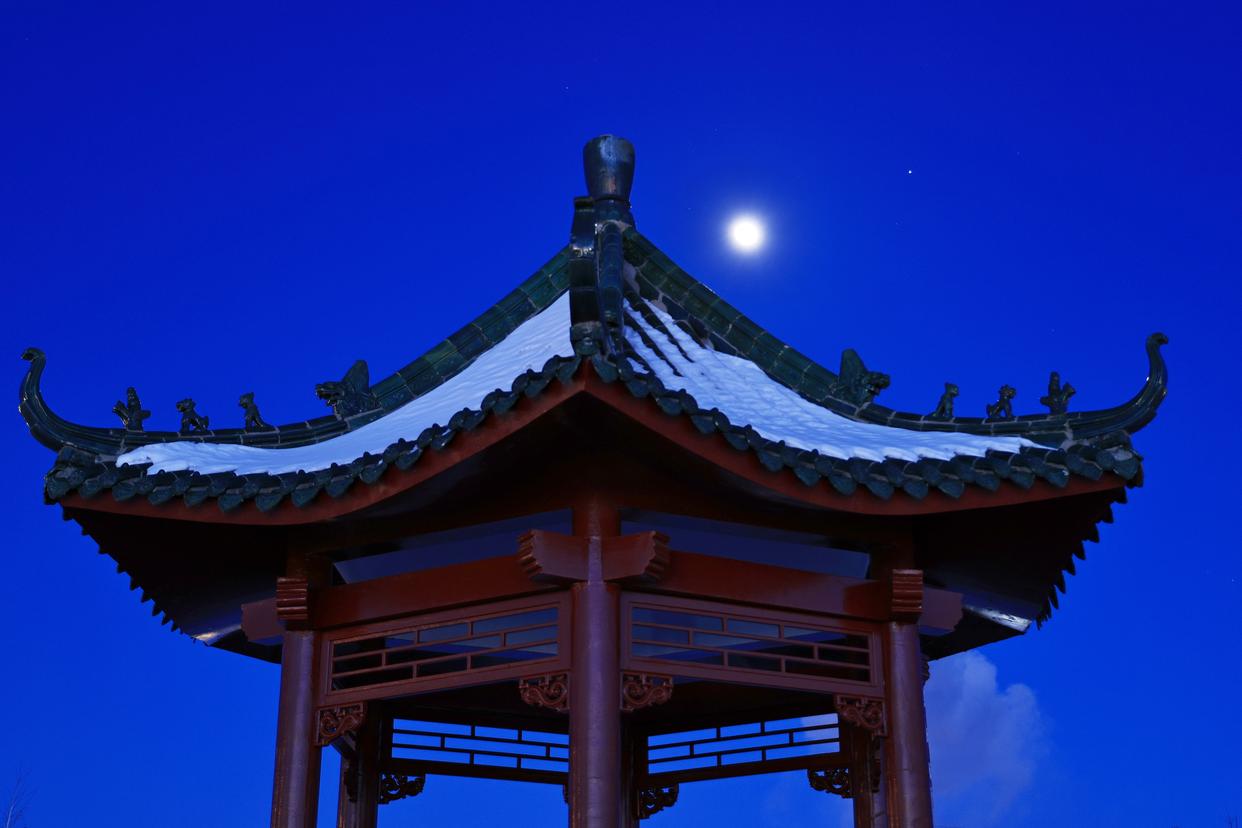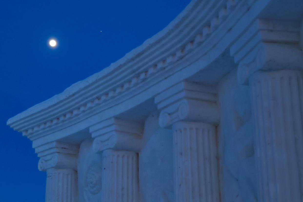 1月31日,在黑龙江省嘉荫县,冰雕与木星伴凸月相映成趣。新华社发(李绍军摄)