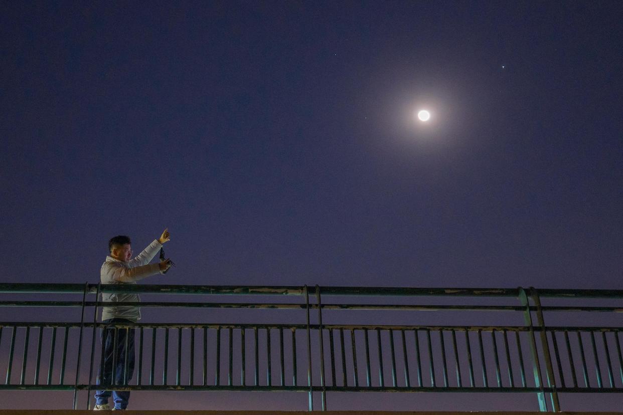1月31日,摄影爱好者在哈尔滨市拍摄木星伴凸月(无人机照片)。新华社发(刘大鹏摄)