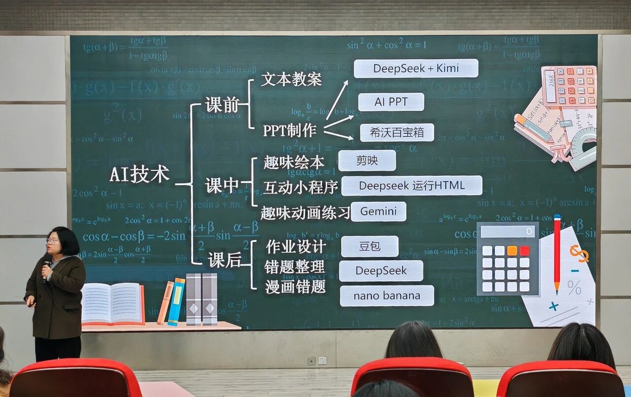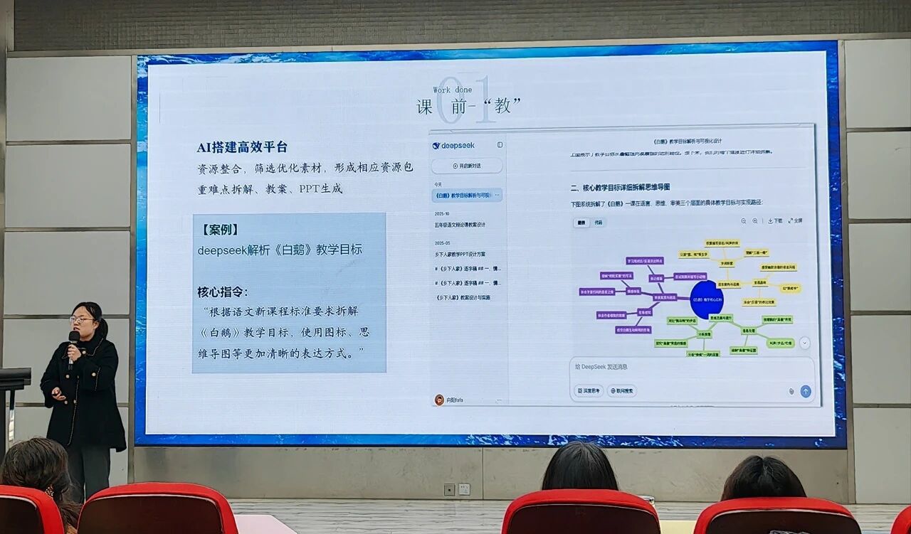 活动中,各科老师带来了“接地气”的AI应用实例。科学老师申方虔介绍了如何用DeepSeek、文心一言等大模型制作虚拟仿真实验,甚至自主开发学科智能体,让抽象的科学概念“活”起来。语文老师向爽展示了AI在课前、课中、课后的全程助力:从生成预习思维导图,到用动态视频打通文字与画面,再到设计朗读打卡工具,实现教学评一体化。