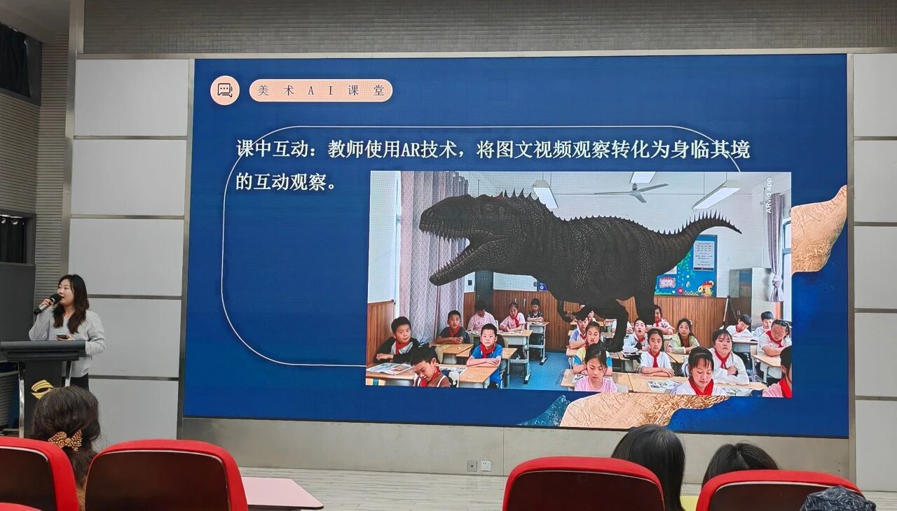音乐和美术课堂同样充满“AI创意”。谭昕玥老师用AI定制乐谱、生成伴奏,甚至为古诗谱曲;徐莹莹老师借助AI进行文生图创作、优化作品细节,并用AR展馆展示学生画作。