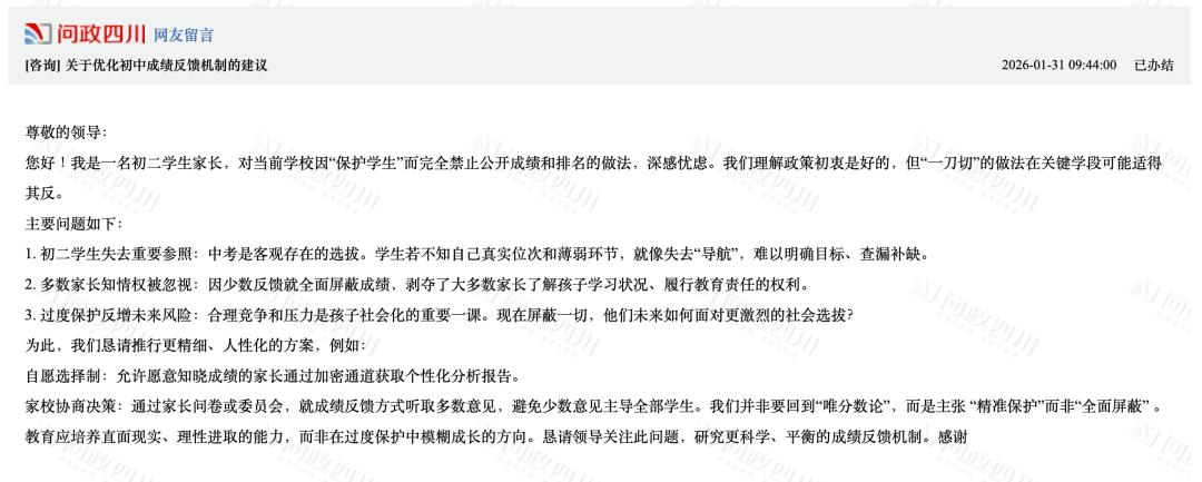 期末考试结束后,在家长获取孩子成绩的环节,义务教育阶段学校因为仅向学生和家长提供等级评价、没有具体分数、不公布排名,近期引起各地家长们的关注。1月31日,有成都家长在问政平台留言:“我是一名初二学生家长,对当前学校因‘保护学生’而完全禁止公开成绩和排名的做法,深感忧虑。我们理解政策初衷是好的,但‘一刀切’的做法在关键学段可能适得其反。”对此,这位家长建议能否“允许愿意知晓成绩的家长通过加密通道获取个性化分析报告”。