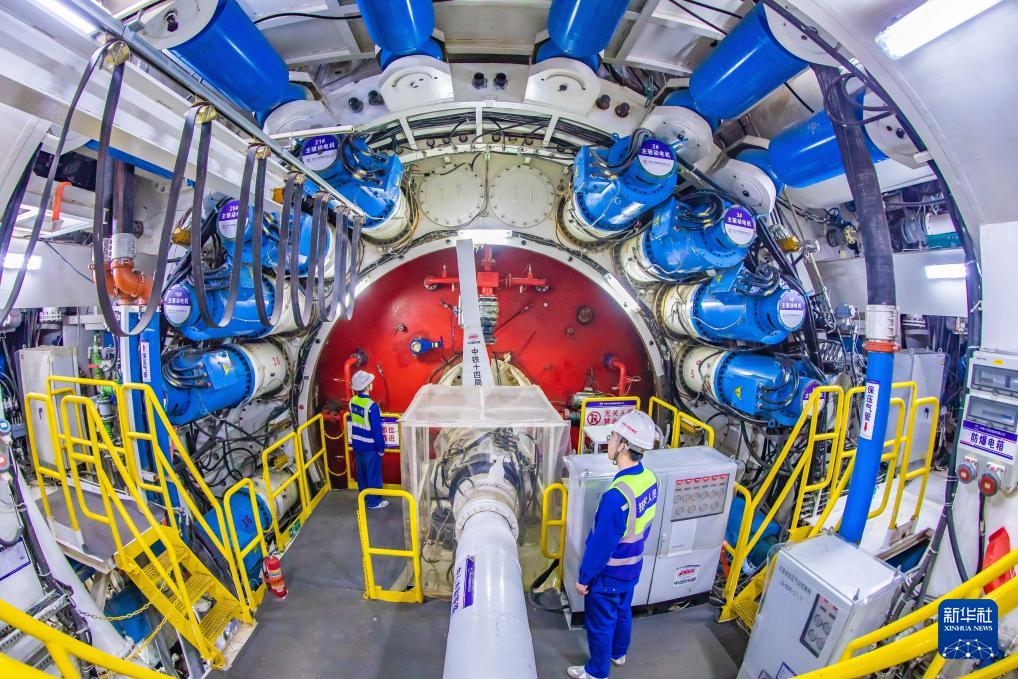 2月6日,中铁十四局技术人员在甬舟铁路金塘海底隧道宁波侧检查“甬舟号”盾构机刀盘运行状态。新华社发(赵荣发摄)