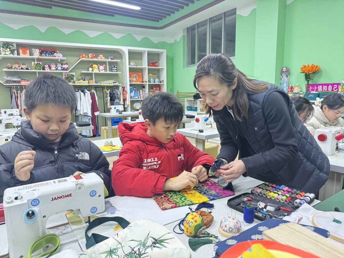六(9)班的10多名学生,正在值守老师何云飞和程桂丽的指导下,专注地制作手工袋。“穿针时眼睛要盯着针孔,线要拉直,慢慢来别急。”老师一边示范,一边手把手纠正孩子们的动作,耐心细致。